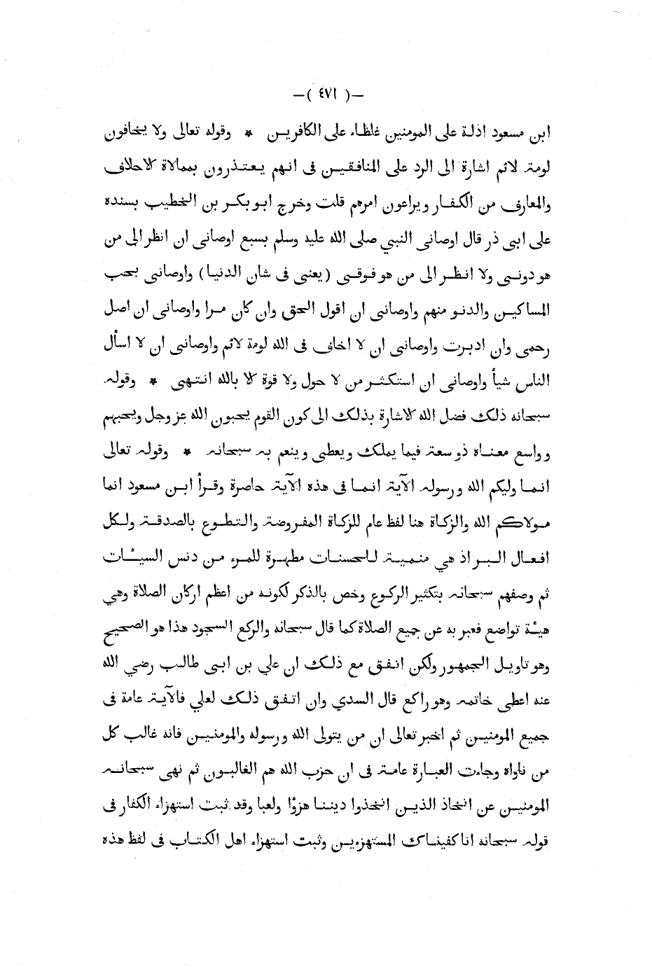 ابن مسعود أذلة على المؤمنين غلظاء على الكافرين وقوله تعالى ولا يخافون لومة لائم إشارة إلى الرد على المنافقين في أنهم يعتذرون بممالاة الأحلاف والمعارف من الكفار ويراعون أمرهم قلت وخرج أبو بكر بن الخطيب بسنده على أبي ذر قال أوصاني النبي صلى الله عليه و سلم بسبع أوصاني أن أنظر إلى من هو دوني ولا أنظر إلى من هو فوقي يعني في شأن الدنيا وأوصاني بحب المساكين والدنو منهم وأوصاني أن أقول الحق وإن كان مرا وأوصاني أن أصل رحمي وإن أدبرت وأوصاني أن لا أخاف في الله لومة لائم وأوصاني أن لا اسأل الناس شيئا وأوصاني أن استكثر من لا حول ولا قوة إلا بالله انتهى وقوله سبحانه ذلك فضل الله الإشارة بذلك إلى كون القوم يحبون الله عز و جل ويحبهم وواسع معناه ذو سعة فيما يملك ويعطي وينعم به سبحانه وقوله تعالى إنما وليكم الله ورسوله الآية إنما في هذه الآية حاصرة وقرأ ابن مسعود إنما مولاكم الله والزكاة هنا لفظ عام للزكاة المفروضة والتطوع بالصدقة ولكل أفعال البر إذ هي منمية للحسنات مطهرة للمرء من دنس السيئات ثم وصفهم سبحانه بتكثير الركوع وخص بالذكر لكونه من أعظم أركان الصلاة وهي هيئة تواضع فعبر به عن جميع الصلاة كما قال سبحانه والركع السجود هذا هو الصحيح وهو تأويل الجمهور ولكن انفق مع ذلك أن علي بن أبي طالب رضي الله عنه أعطى خاتمه وهو راكع قال السدي وإن اتفق ذلك لعلي فالآية عامة في جميع المؤمنين ثم أخبر تعالى إن من يتولى الله ورسوله والمؤمنين فإنه غالب كل من ناواه وجاءت العبارة عامة في أن حزب الله هم الغالبون ثم نهى سبحانه المؤمنين عن اتخاذ الذين اتخذوا ديننا هزؤا ولعبا وقد ثبت استهزاء الكفار في قوله سبحانه انا كفيناك المستهزءين وثبت استهزاء أهل الكتاب في لفظ هذه