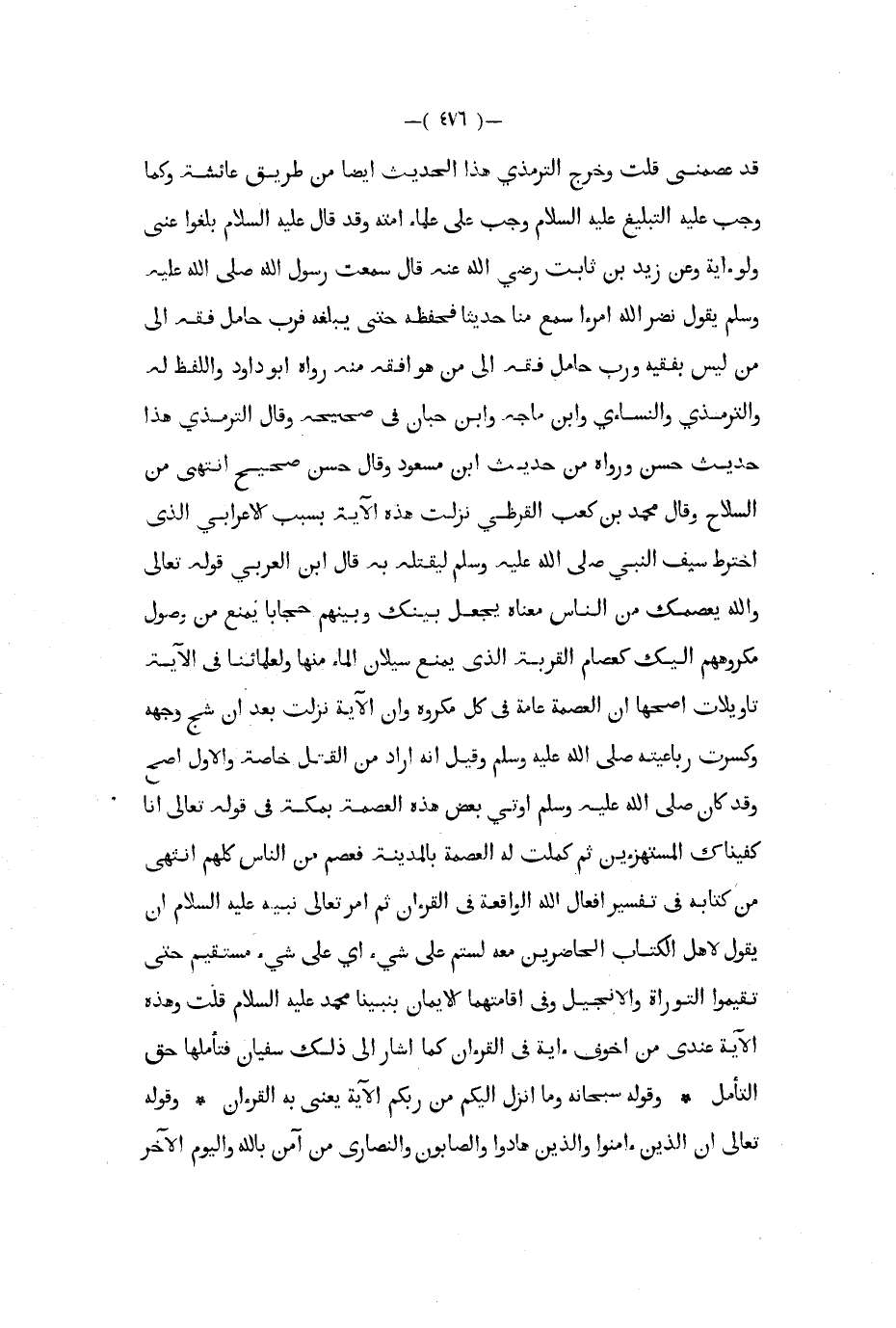 قد عصمنى قلت وخرج الترمذي هذا الحديث أيضا من طريق عائشة وكما وجب عليه التبليغ عليه السلام وجب على علماء أمته وقد قال عليه السلام بلغوا عني ولو آية وعن زيد بن ثابت رضي الله عنه قال سمعت رسول الله صلى الله عليه و سلم يقول نضر الله امرءا سمع منا حديثا فحفظه حتى يبلغه فرب حامل فقه إلى من ليس بفقيه جاهل فقه إلى من هو أفقه منه رواه أبو داود واللفظ له والترمذي والنسائي وابن ماجه وابن حبان في صحيحه وقال الترمذي هذا حديث حسن ورواه من حديث ابن مسعود وقال حسن صحيح انتهى من السلاح وقال محمد بن كعب القرظي نزلت هذه الآية بسبب الإعرابي الذي اخترط سيف النبي صلى الله عليه و سلم ليقتله به قال ابن العربي قوله تعالى والله يعصمك من الناس معناه يجعل بينك وبينهم حجابا يمنع من وصل مكروههم إليك كعصام القربة الذي يمنع سيلان الماء منها ولعلمائنا في الآية تأويلات أصحها أن العصمة عامة في كل مكروه وأن الآية نزلت بعد أن شج وجهه وكسرت رباعيته صلى الله عليه و سلم وقيل أنه أراد من القتل خاصة والأول أصح وقد كان صلى الله عليه و سلم أوتي بعض هذه العصمة بمكة في قوله تعالى إنا كفيناك المستهزءين ثم كملت له العصمة بالمدينة فعصم من الناس كلهم انتهى من كتابه في تفسير أفعال الله الواقعة في القرآن ثم أمر تعالى نبيه عليه السلام أن يقول لأهل الكتاب الحاضرين معه لستم على شيء أي على شيء مستقيم حتى تقيموا التوراة والإنجيل وفي إقامتهما الإيمان بنبينا محمد عليه السلام قلت وهذه الآية عندي من أخوف آية في القرآن كما أشار إلى ذلك سفيان فتأملها حق التأمل وقوله سبحانه وما أنزل إليكم من ربكم الآية يعني به القرآن وقوله تعالى إن الذين ءامنوا والذين هادوا والصابون والنصارى من آمن بالله واليوم الآخر