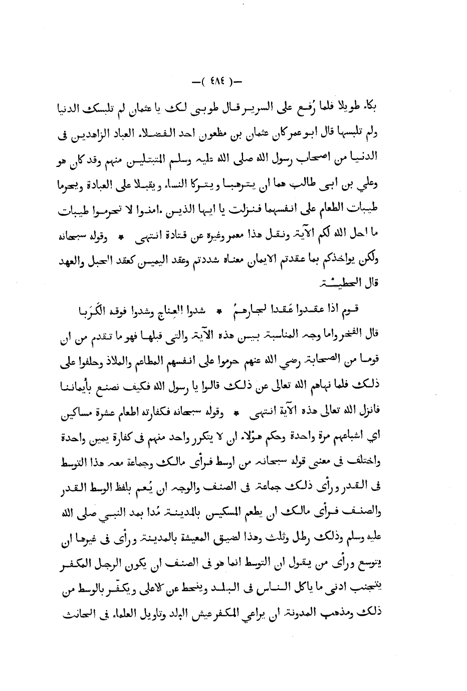 بكاء طويلا فلما رفع على السرير قال طوبى لك يا عثمان لم تلبسك الدنيا ولم تلبسها قال أبو عمر كان عثمان بن مظعون أحد الفضلاء العباد الزاهدين في الدنيا من أصحاب رسول الله صلى الله عليه و سلم المتبتلين منهم وقد كان هو وعلي بن أبي طالب هما أن يترهبا ويتركا النساء ويقبلا على العبادة ويحرما طيبات الطعام على أنفسهما فنزلت يا أيها الذين ءامنوا لا تحرموا طيبات ما أحل الله لكم الآية ونقل هذا معمر وغيره عن قتادة انتهى وقوله سبحانه ولكن يؤاخذكم بما عقدتم الإيمان معناه شددتم وعقد اليمين كعقد الحبل والعهد قال الحطيئة ... قوم إذا عقدوا عقدا لجارهم ... شدوا العناج وشدوا فوقه الكربا ...