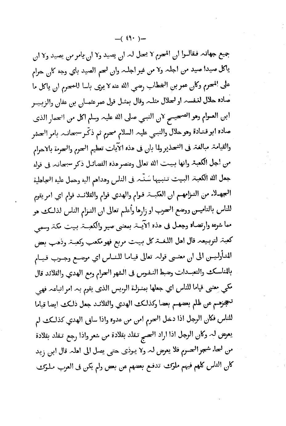 جميع جهاته فقالوا أن المحرم لا يحل له أن يصيد ولا أن يأمر من يصيد ولا أن يأكل صيدا صيد من أجله ولا من غير أجله وأن لحم الصيد بأي وجه كان حرام على المحرم وكان عمر بن الخطاب رضي الله عنه لا يرى بأسا للمحرم أن يأكل ما صاده حلال لنفسه أو لحلال مثله وقال بمثل قول عمر عثمان بن عفان والزبير ابن العوام وهو الصحيح لأن النبي صلى الله عليه و سلم أكل من الحمار الذي صاده أبو قتادة وهو حلال والنبي عليه السلام محرم ثم ذكر سبحانه بأمر الحشر والقيامة مبالغة في التحذير ولما بان في هذه الآيات تعظيم الحرم والحرمة بالاحرام من أجل الكعبة وإنها بيت الله تعالى وعنصر هذه الفضائل ذكر سبحانه في قوله جعل الله الكعبة البيت تنبيها سنه في الناس وهداهم إليه وحمل عليه الجاهلية الجهلاء من التزامهم أن العكبة قوام والهدي قوام والقلائد قوام أي أمر يقوم للناس بالتأمين ووضع الحرب أوزارها وأعلم تعالى أن التزام الناس لذلك هو مما شرعه وارتضاه وجعل في هذه الآية بمعنى صير والكعبة بيت مكة وسمي كعبة لتربيعه قال أهل اللغة كل بيت مربع فهو مكعب وكعبة وذهب بعض المتأولين إلى أن معنى قوله تعالى قياما للناس أي موضع وجوب قيام بالمناسك والتعبدات وضبط النفوس في الشهر الحرام ومع الهدي والقلائد قال مكي معنى قياما للناس أي جعلها بمنزلة الرئيس الذي يقوم به أمر اتباعه فهي تحجزهم عن ظلم بعضهم بعضا وكذلك الهدي والقلائد جعل ذلك أيضا قياما للناس فكان الرجل إذا دخل الحرم أمن من عدوه وإذا ساق الهدي كذلك لم يعرض له وكان الرجل إذا أراد الحج تقلد بقلادة من شعر وإذا رجع تقلد بقلادة من لحاء شجر الحرم فلا يعرض له ولا يؤذى حتى يصل إلى أهله قال ابن زيد كان الناس كلهم فيهم ملوك تدفع بعضهم عن بعض ولم يكن في العرب ملوك