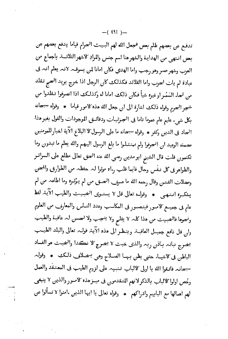 تدفع عن بعضهم ظلم بعض فجعل الله لهم البيت الحرام قياما يدفع بعضهم عن بعض انتهى من الهداية والشهر هنا اسم جنس والمراد الأشهر الثلاثة بإجماع من العرب وشهر مصر وهو رجب وأما الهدي فكان أمانا لمن يسوقه لأنه يعلم أنه في عبادة لم يأت لحرب وأما القلائد فكذلك كان الرجل إذا خرج يريد الحج تقلد من لحاء السمر أو غيره شيئا فكان ذلك أمانا له وكذلك إذا انصرفوا تقلدوا من شجر الحرم وقوله ذلك إشارة إلى أن جعل الله هذه الأمور قياما وقوله سبحانه بكل شيء عليم عام عموما تاما في الجزئيات ودقائق الموجودات والقول بغير هذا إلحاد في الدين وكفر وقوله سبحانه ما على الرسول إلا البلاغ الآية إخبار للمؤمنين مضمنه الوعيد أن انحرفوا ولم يمتثلوا ما بلغ الرسول إليهم والله يعلم ما تبدون وما تكتمون قلت قال الشيخ أبو مدين رضي الله عنه الحق تعالى مطلع على السرائر والظواهر في كل نفس وحال فايما قلت رآه مؤثرا له حفظه من الطوارق والمحن ومضلات الفتن وقال رحمه الله ما عرف الحق من لم يؤثره وما أطاعه من لم يشكره انتهى وقوله تعالى قل لا يستوي الخبيث والطيب الآية لفظ عام في جميع الأمور فيتصور في المكاسب وعدد الناس والمعارف من العلوم ونحوها فالخبيث من هذا كله لا يفلح ولا ينجب ولا تحسن له عاقبة والطيب وإن قل نافع جميل العاقبة وينظر إلى هذه الآية قوله تعالى والبلد الطيب يخرج نباته بإذن ربه والذي خبث لا يخرج إلا نكدا والخبث هو الفساد الباطن في الأشياء حتى يظن بها الصلاح وهي بخلاف ذلك وقوله سبحانه فاتقوا الله يا أولي الألباب تنبيه على لزوم الطيب في المعتقد والعلم وخص أولوا الألباب بالذكر لأنهم المتقدمون في ميز هذه الأمور والذين لا ينبغي لهم إهمالها مع ألبابهم وإدراكهم وقوله تعالى يا أيها الذين ءامنوا لا تسألوا عن