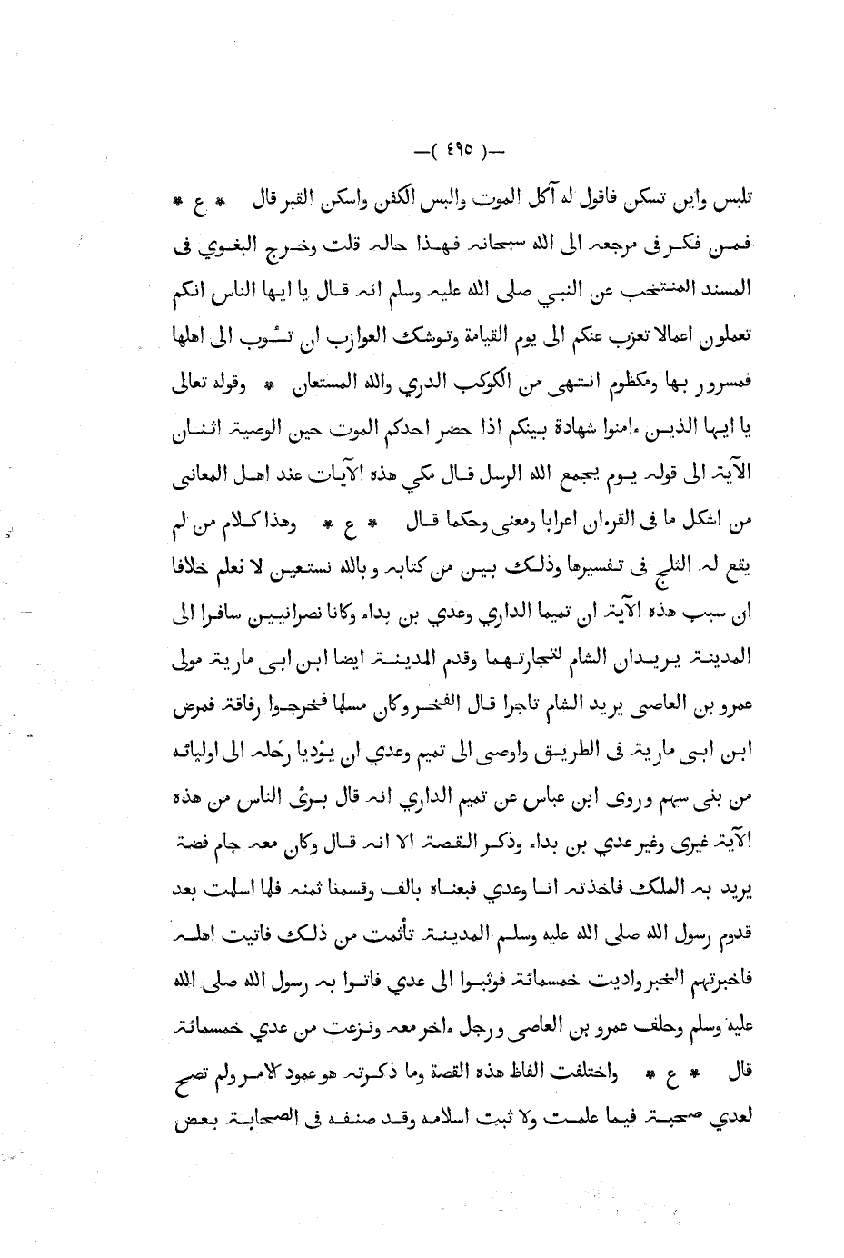 تلبس وأين تسكن فأقول له آكل الموت والبس الكفن واسكن القبر قال ع فمن فكر في مرجعه إلى الله سبحانه فهذا حاله قلت وخرج البغوي في المسند المنتخب عن النبي صلى الله عليه و سلم أنه قال يا أيها الناس أنكم تعملون أعمالا تعزب عنكم إلى يوم القيامة وتوشك العوازب أن تؤب إلى أهلها فمسرور بها ومكظوم انتهى من الكوكب الدري والله المستعان وقوله تعالى يا أيها الذين ءامنوا شهادة بينكم إذا حضر أحدكم الموت حين الوصية اثنان الآية إلى قوله يوم يجمع الله الرسل قال مكي هذه الآيات عند أهل المعاني من اشكل ما في القرءان اعرابا ومعنى وحكما قال ع وهذا كلام من لم يقع له الثلج في تفسيرها وذلك بين من كتابه وبالله نستعين لا نعلم خلافا أن سبب هذه الآية أن تميما الداري وعدي بن بداء وكانا نصرانيين سافرا إلى المدينة يريدان الشام لتجارتهما وقدم المدينة أيضا ابن أبي مارية مولى عمرو بن العاصي يريد الشام تاجرا قال الفخر وكان مسلما فخرجوا رفاقة فمرض ابن أبي مارية في الطريق وأوصى إلى تميم وعدي أن يؤديا رحله إلى اوليائه من بني سهم وروى ابن عباس عن تميم الداري أنه قال برى الناس من هذه الآية غيري وغير عدي بن بداء وذكر القصة إلا أنه قال وكان معه جام فضة يريد به الملك فأخذته أنا وعدي فبعناه بألف وقسمنا ثمنه فلما أسلمت بعد قدوم رسول الله صلى الله عليه و سلم المدينة تأثمت من ذلك فأتيت أهله فأخبرتهم الخبر وأديت خمسمائة فوثبوا إلى عدي فأتوا به رسول الله صلى الله عليه و سلم وحلف عمرو بن العاصي ورجل اخر معه ونزعت من عدي خمسمائة قال ع واختلفت الفاظ هذه القصة وما ذكرته هو عمود الأمر ولم تصح لعدي صحبة فيما علمت ولا ثبت إسلامه وقد صنفه في الصحابة بعض