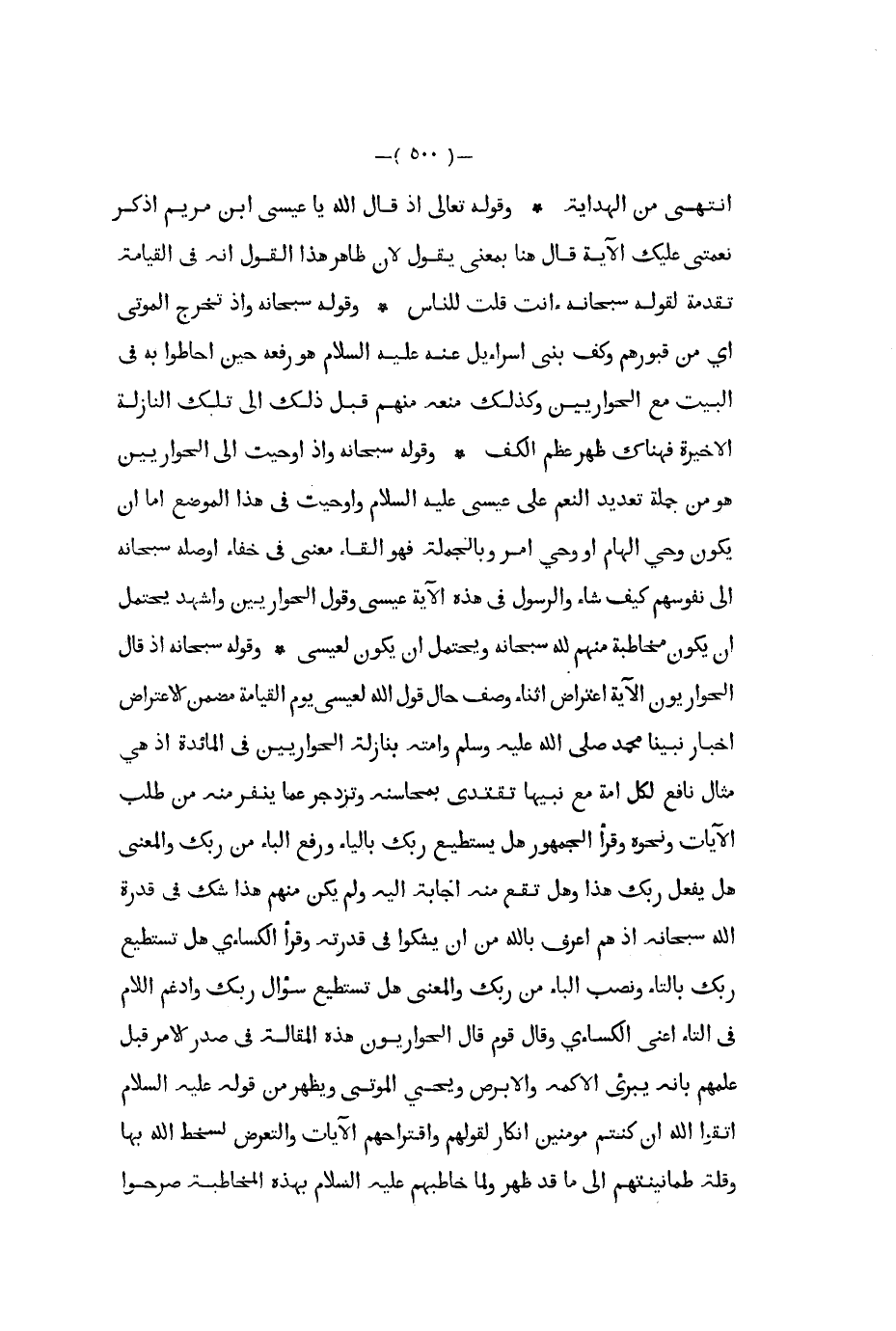 انتهى من الهداية وقوله تعالى إذ قال الله يا عيسى ابن مريم اذكر نعمتي عليك الآية قال هنا بمعنى يقول لان ظاهر هذا القول أنه في القيامة تقدمة لقوله سبحانه ءأنت قلت للناس وقوله سبحانه وإذ تخرج الموتى أي من قبورهم وكف بني إسراءيل عنه عليه السلام هو رفعه حين أحاطوا به في البيت مع الحواريين وكذلك منعه منهم قبل ذلك إلى تلك النازلة الأخيرة فهناك ظهر عظم الكف وقوله سبحانه وإذ أوحيت إلى الحواريين هو من جملة تعديد النعم على عيسى عليه السلام وأوحيت في هذا الموضع أما أن يكون ومي الهام او وحي أمر وبالجملة فهو القاء معنى في خفاء أوصله سبحانه إلى نفوسهم كيف شاء والرسول في هذه الآية عيسى وقول الحواريين وأشهد يحتمل أن يكون مخاطبة منهم لله سبحانه ويحتمل أن يكون لعيسى وقوله سبحانه إذ قال الحواريون الآية اعتراض اثناء وصف حال قول الله لعيسى يوم القيامة مضمن الاعتراض أخبار نبينا محمد صلى الله عليه و سلم وأمته بنازلة الحواريين في المائدة إذ هي مثال نافع لكل أمة مع نبيها تقتدي بمحاسنه وتزدجر عما ينفر منه من طلب الآيات ونحوه وقرأ الجمهور هل يستطيع ربك بالياء ورفع الباء من ربك والمعنى هل يفعل ربك هذا وهل تقع منه إجابة إليه ولم يكن منهم هذا شك في قدرة الله سبحانه إذ هم اعرف بالله من أن يشكوا في قدرته وقرأ الكساءي هل تستطيع ربك بالتاء ونصب الباء من ربك والمعنى هل تستطيع سؤال ربك وادغم اللام في التاء أعنى الكساءي وقال قوم قال الحواريون هذه المقالة في صدر الأمر قبل علمهم بأنه يبرىء الاكمه والأبرص ويحي الموتى ويظهر من قوله عليه السلام اتقوا الله إن كنتم مؤمنين إنكار لقولهم واقتراحهم الآيات والتعرض لسخط الله بها وقلة طمأنينتهم إلى ما قد ظهر ولما خاطبهم عليه السلام بهذه المخاطبة صرحوا