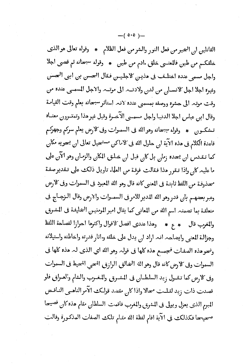 القائلين أن الخير من فعل النور والشر من فعل الظلام وقوله تعالى هو الذي خلقكم من طين فالمعنى خلق آدم من طين وقوله سبحانه ثم قضى أجلا وأجل مسمى عنده اختلف في هذين الاجلين فقال الحسن بن أبي الحسن وغيره أجلا أجل الإنسان من لدن ولادته إلى موته الأجل المسمى عنده من وقت موته إلى حشره ووصفه بمسمى عنده لأنه استأثر سبحانه بعلم وقت القيامة وقال ابن عباس أجلا الدنيا وأجل مسمى الآخرة وقيل غير هذا وتمترون معناه تشكون وقوله سبحانه وهو الله في السموات وفي الأرض يعلم سركم وجهركم قاعدة الكلام في هذه الآية أن حلول الله في الأماكن مستحيل تعالى أن يحويه مكان كما تقدس أن يحده زمان بل كان قبل أن خلق المكان والزمان وهو الآن على ما عليه كان وإذا تقرر هذا فقالت فرقة من العلماء تأويل ذلك على تقدير صفة محذوفة من اللفظ ثابتة في المعنى كأنه قال وهو الله المعبود في السموات وفي الأرض وعبر بعضهم بأن قدر وهو الله المدبر للأمر في السموات والأرض وقال الزجاج في متعلقة بما تضمنه اسم الله من المعاني كما يقال أمير المؤمنين الخليفة في المشرق والمغرب قال ع وهذا عندي أفضل الأقوال وأكثرها إحرازا لفصاحة اللفظ وجزالة المعنى وإيضاحه أنه أراد أن يدل على خلقه وآثار قدرته واحاطته واستيلائه ونحو هذه الصفات فجمع هذه كلها في قوله وهو الله أي الذي له هذه كلها في السموات وفي الأرض كأنه قال وهو الله الخالق الرازق المحي المحيط في السموات وفي الأرض كما تقول زيد السلطان في المشرق والمغرب والشام والعراق فلو قصدت ذات زيد لقلت محالا وإذا كان مقصد قولك الآمر الناهي الناقض المبرم الذي يعزل ويولي في المشرق والمغرب فأقمت السلطان مقام هذه كان فصيحا صحيحا فكذلك في الآية أقام لفظة الله مقام تلك الصفات المذكورة وقالت
