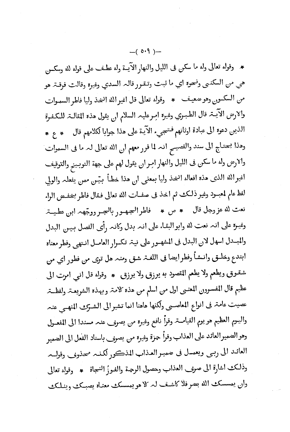 وقوله تعالى وله ما سكن في الليل والنهار الآية وله عطف على قوله لله وسكن هي من السكنى ونحوه أي ما ثبت وتقرر قاله السدي وغيره وقالت فرقة هو من السكون وهو ضعيف وقوله تعالى قل أغير الله اتخذ وليا فاطر السموات والأرض الآية قال الطبري وغيره أمر عليه السلام أن يقول هذه المقالة للكفرة الذين دعوه إلى عبادة أوثانهم فتجيء الآية على هذا جوابا لكلامهم قال ع وهذا يحتاج إلى سند والفصيح أنه لما قرر معهم أن الله تعالى له ما في السموات والأرض وله ما سكن في الليل والنهار أمر أن يقول لهم على جهة التوبيخ والتوقيف أغير الله الذي هذه أفعاله أتخذ وليا بمعنى أن هذا خطأ بين ممن يفعله والولي لفظ عام لمعبود وغير ذلك ثم أخذ في صفات الله تعالى فقال فاطر بخفض الراء نعت لله عز و جل قال ص فاطر الجهور بالجر ووجهه ابن عطية وغيره على أنه نعت لله وأبو البقاء على أنه بدل وكأنه رأى الفصل بين البدل و المبدل اسهل لان البدل في المشهور على نية تكرار العامل انتهى وفطر معناه ابتدع وخلق وانشأ وفطر أيضا في اللغة شق ومنه هل ترى من فطور أي من شقوق ويطعم ولا يطعم المقصود به يرزق ولا يرزق وقوله قل إني أمرت إلى عظيم قال المفسرون المعنى أول من أسلم من هذه الأمة وبهذه الشريعة ولفظة عصيت عامة في أنواع المعاصي ولكنها هاهنا إنما تشير إلى الشرك المنهي عنه واليوم العظيم هو يوم القيامة وقرأ نافع وغيره من يصرف عنه مسندا إلى المفعول وهو الضمير العائد على العذاب وقرأ حمزة وغيره من يصرف بإسناد الفعل إلى الضمير العائد إلى ربي ويعمل في ضمير العذاب المذكور لكنه محذوف وقوله وذلك إشارة إلى صرف العذاب وحصول الرحمة والفوز النجاة وقوله تعالى وإن يمسسك الله بضر فلا كاشف له إلا هو يمسسك معناه يصبك وينلك
