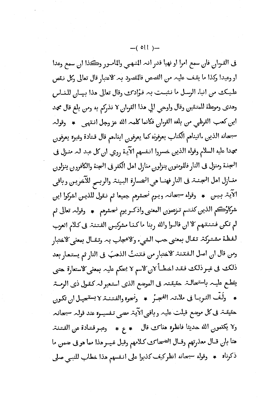في القرآن فإن سمع أمرا أو نهيا قدر أنه المنهي والمأمور وكذا إن سمع وعدا أو وعيدا وكذا ما يقف عليه من القصص فالمقصود به الاعتبار قال تعالى وكل نقص عليك من أنباء الرسل ما نثبت به فؤادك وقال تعالى هذا بيان للناس وهدى وموعظة للمتقين وقال وأوحي إلي هذا القرآن لإنذركم به ومن بلغ قال محمد ابن كعب القرظي من بلغه القرآن فكأنما كلمه الله عز و جل انتهى وقوله سبحانه الذين ءاتيناهم الكتاب يعرفونه كما يعرفون أبناءهم قال قتادة وغيره يعرفون محمدا عليه السلام وقوله الذين خسروا أنفسهم الآية روي أن كل عبد له منزل في الجنة ومنزل في النار فالمؤمنون ينزلون منازل أهل الكفر في الجنة والكافرون ينزلون منازل أهل الجنة في النار فهنا هي الخسارة البينة والربح للآخرين وباقي الآية بين وقوله سبحانه ويوم نحشرهم جميعا ثم نقول للذين أشركوا أين شركاؤكم الذين كنتم تزعمون المعنى واذكر يوم نحشرهم وقوله تعالى ثم لم تكن فتنتهم إلا أن قالوا والله ربنا ما كنا مشركين الفتنة في كلام العرب لفظة مشتركة تقال بمعنى حب الشيء والإعجاب به وتقال بمعنى الاختبار ومن قال إن أصل الفتنة الاختبار من فتنت الذهب في النار ثم يستعار بعد ذلك في غير ذلك فقد اخطأ لان الاسم لا يحكم عليه بمعنى الاستعارة حتى يقطع عليه باستحالة حقيقته في الموضع الذي استعير له كقول ذي الرمة ولف الثريا في ملاءته الفجر ونحوه والفتنة لا يستحيل أن تكون حقيقة في كل موضع قيلت عليه وباقي الآية مضى تفسيره عند قوله سبحانه ولا يكتمون الله حديثا فأنظره هناك قال ع وعبر قتادة عن الفتنة هنا بأن قال معذرتهم وقال الضحاك كلامهم وقيل غير هذا مما هو في ضمن ما ذكرناه وقوله سبحانه انظر كيف كذبوا على أنفسهم هذا خطاب للنبي صلى