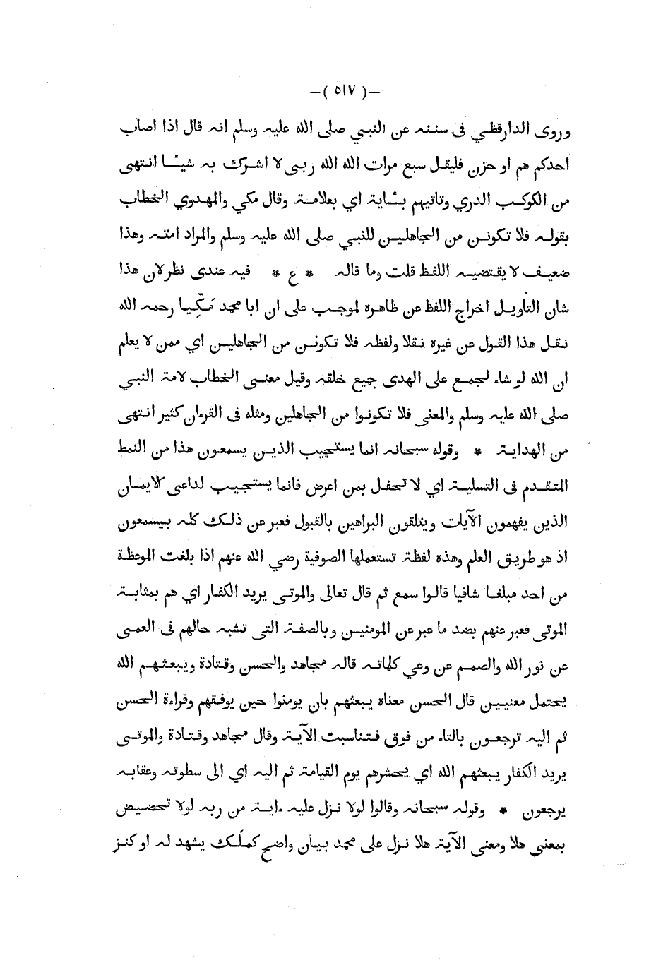 وروى الدارقظي في سننه عن النبي صلى الله عليه و سلم أنه قال إذا أصاب أحدكم هم أو حزن فليقل سبع مرات الله الله ربى لا أشرك به شيأ انتهى من الكوكب الدري وتأتيهم بآية أي بعلامة وقال مكي والمهدوي الخطاب بقوله فلا تكونن من الجاهلين للنبي صلى الله عليه و سلم والمراد أمته وهذا ضعيف لا يقتضيه اللفظ قلت وما قاله ع فيه عندي نظر لأن هذا شأن التأويل إخراج اللفظ عن ظاهره لموجب على أن أبا محمد مكيا رحمه الله نقل هذا القول عن غيره نقلا ولفظه فلا تكونن من الجاهلين أي ممن لا يعلم أن الله لو شاء لجمع على الهدى جميع خلقه وقيل معنى الخطاب لأمة النبي صلى الله عليه و سلم والمعنى فلا تكونوا من الجاهلين ومثله في القرآن كثير انتهى من الهداية وقوله سبحانه إنما يستجيب الذين يسمعون هذا من النمط المتقدم في التسلية أي لا تحفل بمن أعرض فإنما يستجيب لداعي الإيمان الذين يفهمون الآيات ويتلقون البراهين بالقبول فعبر عن ذلك كله بيسمعون إذ هو طريق العلم وهذه لفظة تستعملها الصوفية رضي الله عنهم إذا بلغت الموعظة من أحد مبلغا شافيا قالوا سمع ثم قال تعالى والموتى يريد الكفار أي هم بمثابة الموتى فعبر عنهم بضد ما عبر عن المؤمنين وبالصفة التي تشبه حالهم في العمى عن نور الله والصمم عن وعي كلماته قاله مجاهد والحسن وقتادة ويبعثهم الله يحتمل معنيين قال الحسن معناه يبعثهم بأن يؤمنوا حين يوفقهم وقراءة الحسن ثم إليه ترجعون بالتاء من فوق فتناسبت الآية وقال مجاهد وقتادة والموتى يريد الكفار يبعثهم الله أي يحشرهم يوم القيامة ثم إليه أي إلى سطوته وعقابه يرجعون وقوله سبحانه وقالوا لولا نزل عليه آية من ربه لولا تحضيض بمعنى هلا ومعنى الآية هلا نزل على محمد بيان واضح كملك يشهد له أو كنز