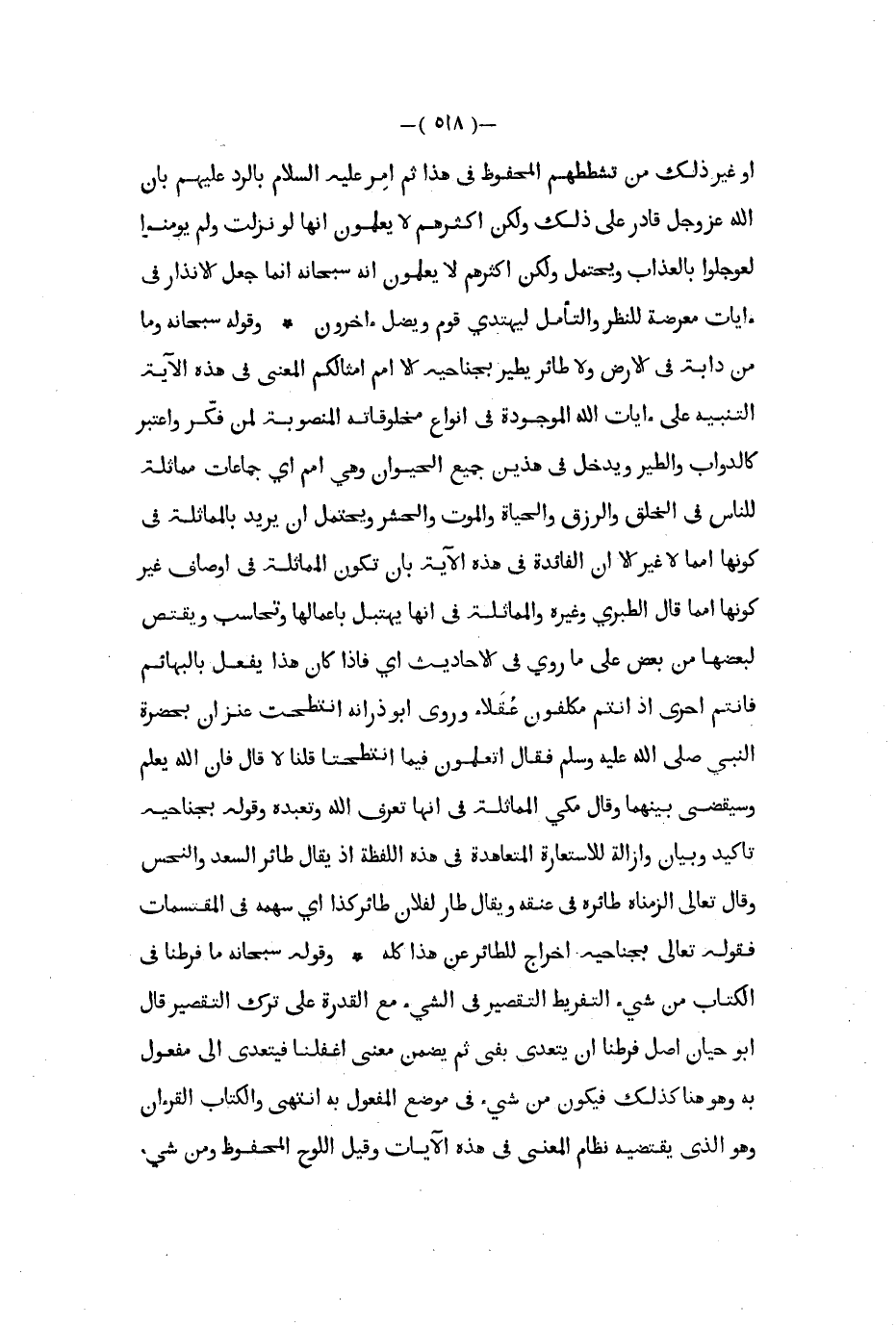 أو غير ذلك من تشططهم المحفوظ في هذا ثم أمر عليه السلام بالرد عليهم بأن الله عز و جل قادر على ذلك ولكن أكثرهم لا يعلمون أنها لو نزلت ولم يؤمنوا لعوجلوا بالعذاب ويحتمل ولكن أكثرهم لا يعلمون أنه سبحانه إنما جعل الإنذار في ءايات معرضة للنظر والتأمل ليهتدي قوم ويضل آخرون وقوله سبحانه وما من دابة في الأرض ولا طائر يطير بجناحيه إلا أمم أمثالكم المعنى في هذه الآية التنبيه على ءايات الله الموجودة في أنواع مخلوقاته المنصوبة لمن فكر واعتبر كالدواب والطير ويدخل في هذين جميع الحيوان وهي أمم أي جماعات مماثلة للناس في الخلق والرزق والحياة والموت والحشر ويحتمل أن يريد بالمماثلة في كونها أمما لا غير إلا أن الفائدة في هذه الآية بأن تكون المماثلة في أوصاف غير كونها أمما قال الطبري وغيره والمماثلة في أنها يهتبل بأعمالها وتحاسب ويقتص لبعضها من بعض على ما روي في الأحاديث أي فإذا كان هذا يفعل بالبهائم فأنتم أحرى إذ أنتم مكلفون عقلاء وروي أبو ذر أنه انتطحت عنزان بحضرة النبي صلى الله عليه و سلم فقال أتعلمون فيما انتطحتا قلنا لا قال فإن الله يعلم وسيقضى بينهما وقال مكي المماثلة في أنها تعرف الله وتعبده وقوله بجناحيه تأكيد وبيان وإزالة للاستعارة المتعاهدة في هذه اللفظة إذ يقال طائر السعد والنحس وقال تعالى الزمناه طائره في عنقه ويقال طار لفلان طائر كذا أي سهمه في المقسمات فقوله تعالى بجناحيه إخراج للطائر عن هذا كله وقوله سبحانه ما فرطنا في الكتاب من شيء التفريط التقصير في الشيء مع القدرة على ترك التقصير قال أبو حيان أصل فرطنا أن يتعدى بفى ثم يضمن معنى أغفلنا فيتعدى إلى مفعول به وهو هنا كذلك فيكون من شيء في موضع المفعول به انتهى والكتاب القرآن وهو الذي يقتضيه نظام المعنى في هذه الآيات وقيل اللوح المحفوظ ومن شيء