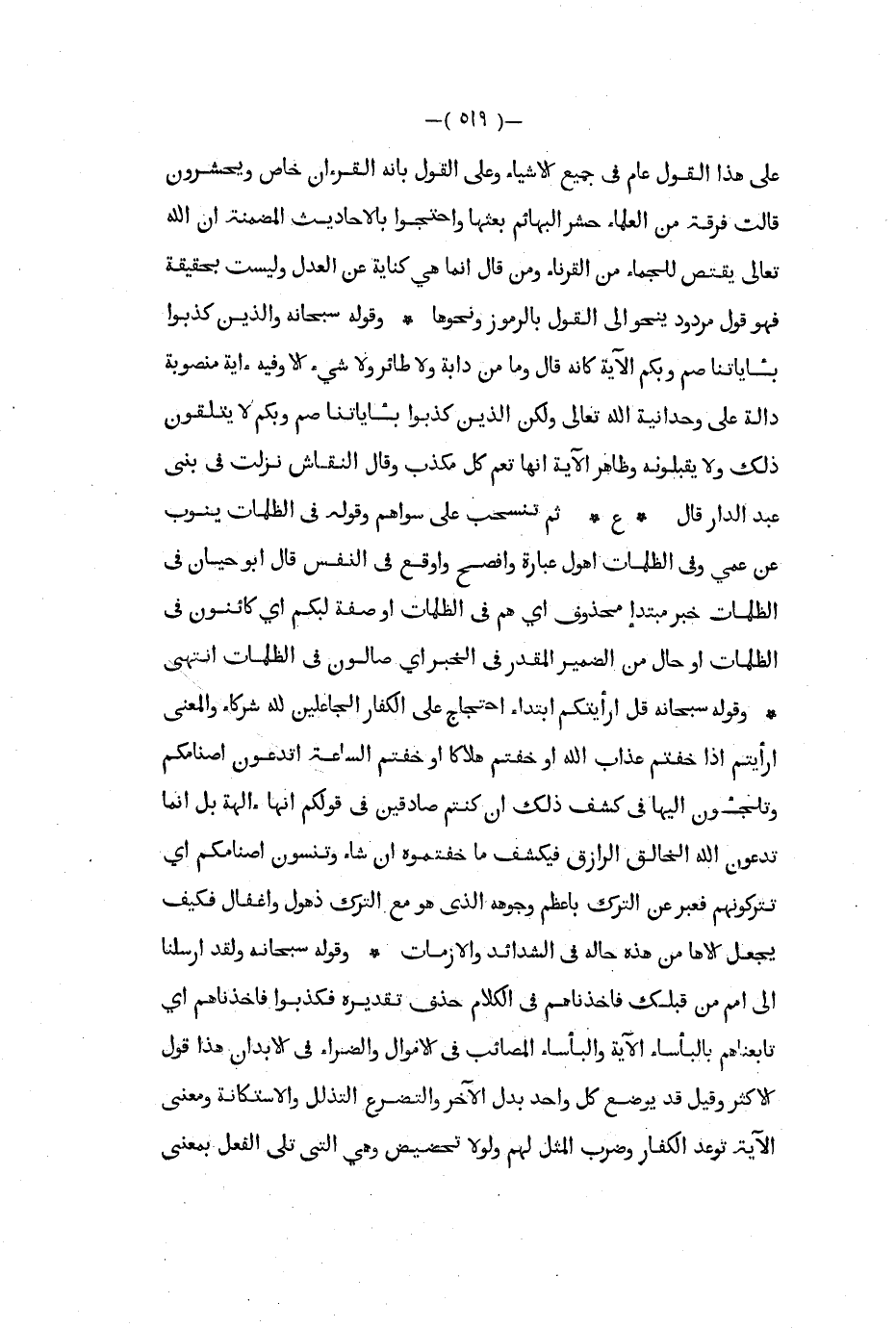 على هذا القول عام في جميع الأشياء وعلى القول بأنه القرآن خاص ويحشرون قالت فرقة من العلماء حشر البهائم بعثها واحتجوا بالأحاديث المضمنة أن الله تعالى يقتص للجماء من القرناء ومن قال إنما هي كناية عن العدل وليست بحقيقة فهو قول مردود ينحو إلى القول بالرموز ونحوها وقوله سبحانه والذين كذبوا بأياتنا صم وبكم الآية كأنه قال وما من دابة ولا طائر ولا شيء إلا وفيه ءاية منصوبة دالة على وحدانية الله تعالى ولكن الذين كذبوا بآياتنا صم وبكم لا يتلقون ذلك ولا يقبلونه وظاهر الآية أنها تعم كل مكذب وقال النقاش نزلت في بنى عبد الدار قال ع ثم تنسحب على سواهم وقوله في الظلمات ينوب عن عمي وفي الظلمات أهول عبارة وأفصح وأوقع في النفس قال أبو حيان في الظلمات خبر مبتدأ محذوف أي هم في الظلمات أو صفة لبكم أي كائنون في الظلمات أو حال من الضمير المقدر في الخبر أي صالون في الظلمات انتهى وقوله سبحانه قل ارأيتكم ابتداء احتجاج على الكفار الجاعلين لله شركاء والمعنى ارأيتم إذا خفتم عذاب الله أو خفتم هلاكا أو خفتم الساعة أتدعون أصنامكم وتلجؤن إليها في كشف ذلك أن كنتم صادقين في قولكم أنها ءالهة بل إنما تدعون الله الخالق الرازق فيكشف ما خفتموه أن شاء وتنسون أصنامكم أي تتركونهم فعبر عن الترك بأعظم وجوهه الذي هو مع الترك ذهول وإغفال فكيف يجعل إلاها من هذه حاله في الشدائد والأزمات وقوله سبحانه ولقد ارسلنا إلى امم من قبلك فأخذناهم في الكلام حذف تقديره فكذبوا فأخذناهم أي تابعناهم بالبأساء الآية والبأساء المصائب في الأموال والضراء في الأبدان هذا قول الأكثر وقيل قد يوضع كل واحد بدل الآخر والتضرع التذلل والاستكانة ومعنى الآية توعد الكفار وضرب المثل لهم ولولا تحضيض وهي التي تلي الفعل بمعنى