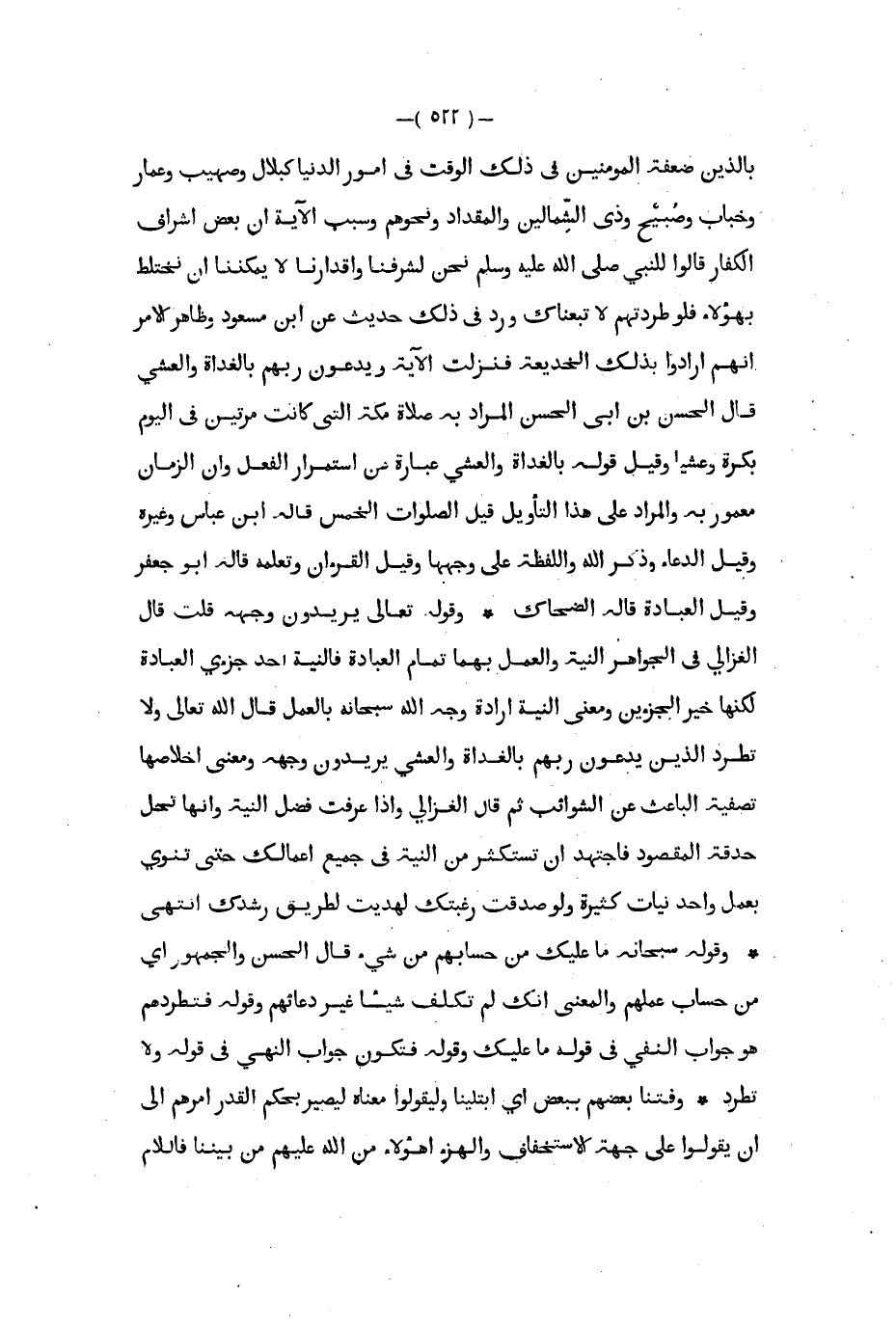 بالذين ضعفة المؤمنين في ذلك الوقت في أمور الدنيا كبلال وصهيب وعمار وخباب وصبيح وذي الشمالين والمقداد ونحوهم وسبب الآية أن بعض أشراف الكفار قالوا للنبي صلى الله عليه و سلم نحن لشرفنا وأقدارنا لا يمكننا أن نختلط بهؤلاء فلو طردتهم لاتبعناك ورد في ذلك حديث عن أبن مسعود وظاهر الأمر أنهم أرادوا بذلك الخديعة فنزلت الآية ويدعون ربهم بالغداة والعشي قال الحسن بن أبي الحسن المراد به صلاة مكة التي كانت مرتين في اليوم بكرة وعشيا وقيل قوله بالغداة والعشي عبارة من استمرار الفعل وأن الزمان معمور به والمراد على هذا التأويل قيل الصلوات الخمس قاله ابن عباس وغيره وقيل الدعاء وذكر الله واللفظة على وجهها وقيل القرآن وتعلمه قال أبو جعفر وقيل العبادة قاله الضحاك وقوله تعالى يريدون وجهه قلت قال الغزالي في الجواهر النية والعمل بهما تمام العبادة فالنية أحد جزئي العبادة لكنها خير الجزءين ومعنى النية إرادة وجه الله سبحانه بالعمل قال الله تعالى ولا تطرد الذين يدعون ربهم بالغداة والعشي يريدون وجهه ومعنى اخلاصها تصفية الباعث عن الشوائب ثم قال الغزالي وإذا عرفت فضل النية وأنها تحل حدقة المقصود فاجتهد أن تستكثر من النية في جميع أعمالك حتى تنوي بعمل واحد نيات كثيرة ولو صدقت رغبتك لهديت لطريق رشدك انتهى وقوله سبحانه ما عليك من حسابهم من شيء قال الحسن والجمهور أي من حساب عملهم والمعنى أنك لم تكلف شيئا غير دعائهم وقوله فتطردهم هو جواب النفي في قوله ما عليك وقوله فتكون جواب النهي في قوله ولا تطرد وفتنا بعضهم ببعض أي ابتلينا وليقولوا معناه ليصير بحكم القدر أمرهم إلى أن يقولوا على جهة الإستخفاف والهزء أهؤلاء من الله عليهم من بيننا فاللام