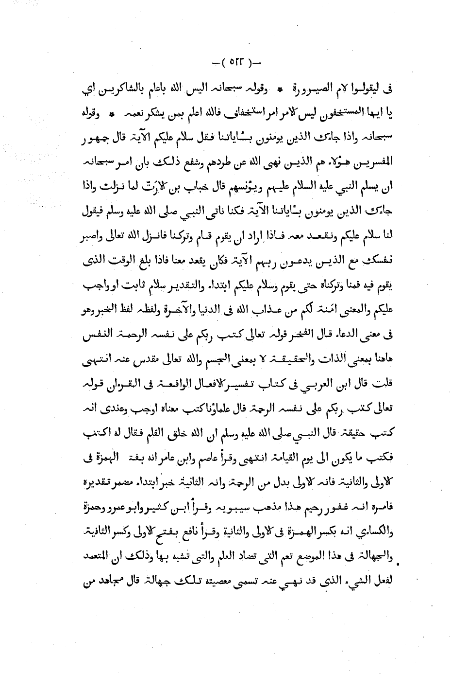 في ليقولوا لام الصيرورة وقوله سبحانه أليس الله بأعلم بالشاكرين أي يا أيها المستخفون ليس الأمر أمر استخفاف فالله أعلم بمن يشكر نعمه وقوله سبحانه وإذا جاءك الذين يؤمنون بآياتنا فقل سلام عليكم الآية قال جمهور المفسرين هؤلاء هم الذين نهي الله عن طردهم وشفع ذلك بأن امر سبحانه أن يسلم النبي عليه السلام عليهم ويؤنسهم قال خباب بن الأرت لما نزلت وإذا جاءك الذين يؤمنون بآياتنا الآية فكنا نأتي النبي صلى الله عليه و سلم فيقول لنا سلام عليكم ونقعد معه فإذا أراد أن يقوم قام وتركنا فأنزل الله تعالى وأصبر نفسك مع الذين يدعون ربهم الآية فكان يقعد معنا فإذا بلغ الوقت الذي يقوم فيه قمنا وتركناه حتى يقوم وسلام عليكم ابتداء والتقدير سلام ثابت أو واجب عليكم والمعنى أمنة لكم من عذاب الله في الدنيا والآخرة ولفظه ولفظ الخبر وهو في معنى الدعاء قال الفخر قوله تعالى كتب ربكم على نفسه الرحمة النفس هاهنا بمعنى الذات والحقيقة لا بمعنى الجسم والله تعالى مقدس عنه انتهى قلت قال ابن العربي في كتاب تفسير الأفعال الواقعة في القرآن قوله تعالى كتب ربكم على نفسه الرحمة قال علماؤنا كتب معناه أوجب وعندي أنه كتب حقيقة قال النبي صلى الله عليه و سلم إن الله خلق القلم فقال له أكتب فكتب ما يكون إلى يوم القيامة انتهى وقرأ عاصم وابن عامر أنه بفتح الهمزة في الأولى والثانية فإنه الأولى بدل من الرحمة وأنه الثانية خبر ابتداء مضمر تقديره فأمره أنه غفور رحيم هذا مذهب سيبويه وقرأ ابن كثير وأبو عمرو وحمزة والكساءي أنه بكسر الهمزة في الأولى والثانية وقرأ نافع بفتح الأولى وكسر الثانية والجهالة في هذا الموضع تعم التي تضاد العلم والتي تشبه بها وذلك ان المتعمد لفعل الشيء الذي قد نهي عنه تسمى معصيته تلك جهالة قال مجاهد من