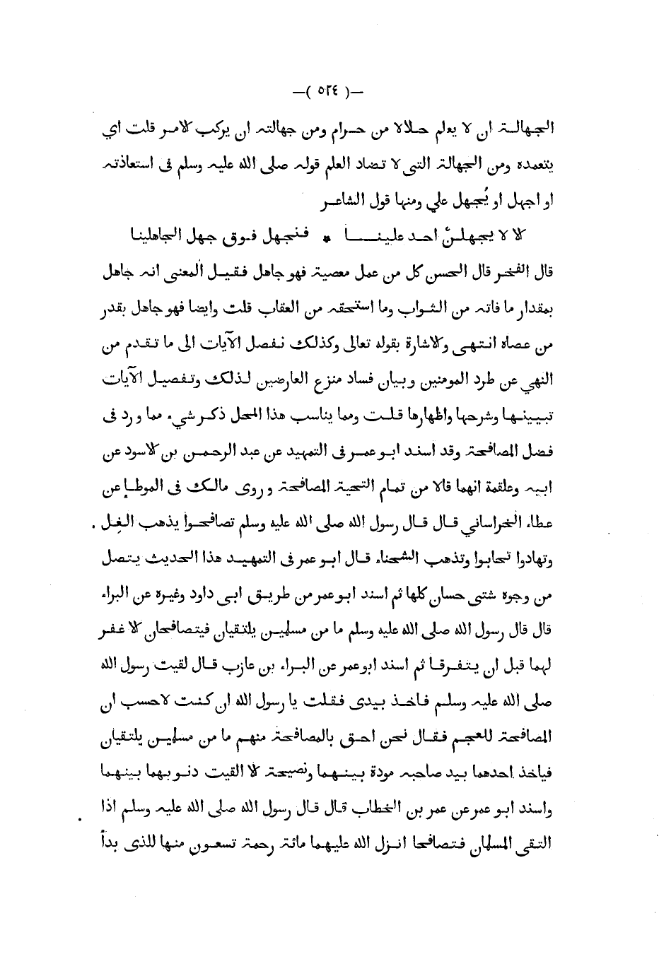 قال الفخر قال الحسن كل من عمل معصية فهو جاهل فقيل المعنى أنه جاهل بمقدار ما فاته من الثواب وما استحقه من العقاب قلت وأيضا فهو جاهل بقدر من عصاه انتهى والإشارة بقوله تعالى وكذلك نفصل الآيات إلى ما تقدم من النهي عن طرد المؤمنين وبيان فساد منزع العارضين لذلك وتفصيل الآيات تبيينها وشرحها وإظهارها قلت ومما يناسب هذا المحل ذكر شيء مما ورد في فصل المصافحة وقد اسند أبو عمر في التمهيد عن عبد الرحمن بن الأسود عن أبيه وعلقمة أنهما قالا من تمام التحية المصافحة وروى مالك في الموطأ عن عطاء الخرساني قال قال رسول الله صلى الله عليه و سلم تصافحوا يذهب الغل وتهادوا تحابوا وتذهب الشحناء قال أبوعمر في التمهيد هذا الحديث يتصل من وجوه شتى حسان كلها ثم اسند أبو عمر من طريق أبي داود وغيره عن البراء قال قال رسول الله صلى الله عليه و سلم ما من مسلمين يلتقيان فيتصافحان إلا غفر لهما قبل أن يتفرقا ثم أسند أبو عمر عن البراء بن عازب قال لقيت رسول الله صلى الله عليه و سلم فأخذ بيدي فقلت يا رسول الله إن كنت لاحسب أن المصافحة للعجم فقال نحن أحق بالمصافحة منهم ما من مسلمين يلتقيان فيأخذ أحدهما بيد صاحبه مودة بينهما ونصيحة إلا القيت ذنوبهما بينهما وأسند أبو عمر عن عمر بن الخطاب قال قال رسول الله صلى الله عليه و سلم إذا التقى المسلمان فتصافحا انزل الله عليهما مائة رحمة تسعون منها للذي بدأ