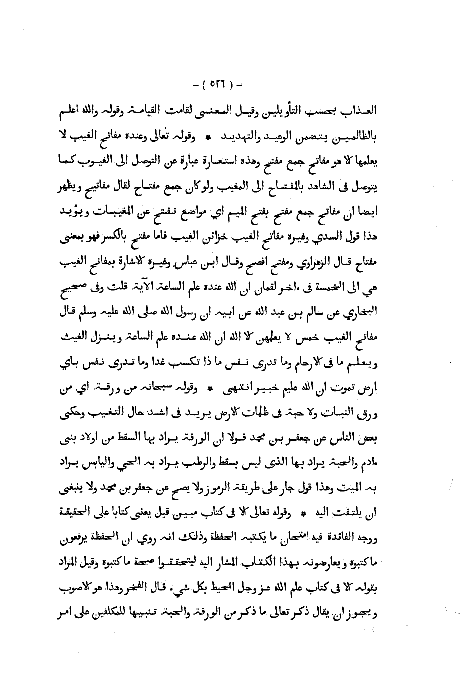 العذاب بحسب التأويلين وقيل المعنى لقامت القيامة وقوله والله أعلم بالظالمين يتضمن الوعيد والتهديد وقوله تعالى وعنده مفاتح الغيب لا يعلمها إلا هو مفاتح جمع مفتح وهذه استعارة عبارة عن التوصل إلى الغيوب كما يتوصل في الشاهد بالمفتاح إلى المغيب ولو كان جمع مفتاح لقال مفاتيح ويظهر أيضا أن مفاتح جمع مفتح بفتح الميم أي مواضع تفتح عن المغيبات ويؤيد هذا قول السدي وغيره مفاتح الغيب خزائن الغيب فأما مفتح بالكسر فهو بمعنى مفتاح قال الزهراوي ومفتح أفصح وقال ابن عباس وغيره الإشارة بمفاتح الغيب هي إلى الخمسة في آخر لقمان إن الله عنده علم الساعة الآية قلت وفي صحيح البخاري عن سالم بن عبد الله عن أبيه أن رسول الله صلى الله عليه و سلم قال مفاتح الغيب خمس لا يعلمهن إلا الله إن الله عنده علم الساعة وينزل الغيث ويعلم ما في الأرحام وما تدري نفس ماذا تكسب غدا وما تدري نفس بأي أرض تموت إن الله عليم خبير انتهى وقوله سبحانه من ورقة أي من ورق النبات ولا حبة في ظلمات الأرض يريد في أشد حال التغيب وحكى بعض الناس عن جعفر بن محمد قولا أن الورقة يراد بها القسط من أولاد بني آدم والحبة يراد بها الذي ليس بسقط والرطب يراد به الحي واليابس يراد به الميت وهذا قول جار على طريقة الرموز ولا يصح عن جعفر بن محمد ولا ينبغي أن يلتفت إليه وقوله تعالى إلا في كتاب مبين قيل يعني كتابا على الحقيقة ووجه الفائدة فيه امتحان ما يكتبه الحفظة وذلك أنه روي أن الحفظة يرفعون ما كتبوه ويعارضونه بهذا الكتاب المشار إليه ليتحققوا صحة ما كتبوه وقيل المراد بقوله إلا في كتاب علم الله عز و جل المحيط بكل شيء قال الفخر وهذا هو الأصوب ويجوز أن يقال ذكر تعالى ما ذكر من الورقة والحبة تنبيها للمكلفين على أمر