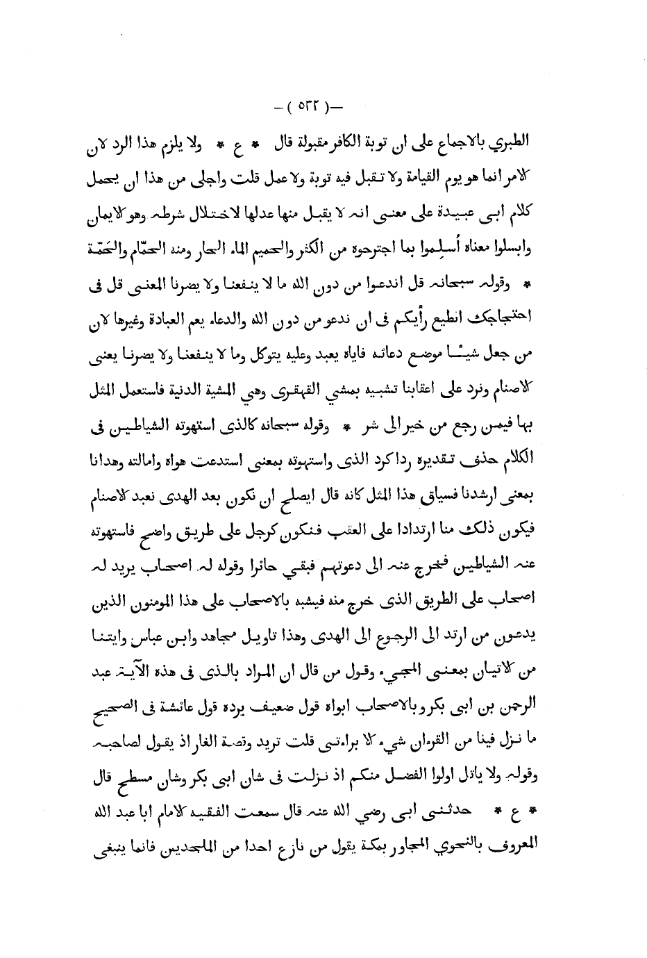 الطبري بالإجماع على أن توبة الكافر مقبولة قال ع ولا يلزم هذا الرد لأن الأمر إنما هو يوم القيامة ولا تقبل فيه توبة ولا عمل قلت وأجلي من هذا أن يحمل كلام أبي عبيدة على معنى أنه لا يقبل منها عدلها لاختلال شرطه وهو الإيمان وابسلوا معناه اسلموا بما اجترحوه من الكفر والحميم الماء الحار ومنه الحمام والحمة وقوله سبحانه قل اندعوا من دون الله ما لا ينفعنا ولا يضرنا المعنى قل في احتجاجك انطيع رأيكم في أن ندعو من دون الله والدعاء يعم العبادة وغيرها لأن من جعل شيئا موضع دعائه فإياه يعبد وعليه يتوكل وما لا ينفعنا ولا يضرنا يعني الأصنام ونرد على اعقابنا تشبيه بمشي القهقري وهي المشية الدنية فاستعمل المثل بها فيمن رجع من خير إلى شر وقوله سبحانه كالذي استهوته الشياطين في الكلام حذف تقديره ردا كرد الذي واستهوته بمعنى استدعت هواه وأمالته وهدانا بمعنى أرشدنا فسياق هذا المثل كأنه قال أيصلح ان نكون بعد الهدى نعبد الأصنام فيكون ذلك منا ارتدادا على العقب فنكون كرجل على طريق واضح فاستهوته عنه الشياطين فخرج عنه إلى دعوتهم فبقي حائرا وقوله له أصحاب يريد له أصحاب على الطريق الذي خرج منه فيشبه بالأصحاب على هذا المؤمنون الذين يدعون من ارتد إلى الرجوع إلى الهدى وهذا تأويل مجاهد وابن عباس وايتنا من الإتيان بمعنى المجيء وقول من قال إن المراد بالذي في هذه الآية عبد الرحمن بن أبي بكر وبالأصحاب أبواه قول ضعيف يرده قول عائشة في الصحيح ما نزل فينا من القرآن شيء إلا براءتي قلت تريد وقصة الغار إذ يقول لصاحبه وقوله ولا يأتل اولوا الفضل منكم إذ نزلت في شأن ابي بكر وشأن مسطح قال ع حدثني أبي رضي الله عنه قال سمعت الفقيه الإمام ابا عبد الله المعروف بالنحوي المجاور بمكة يقول من نازع أحدا من الملحدين فإنما ينبغي