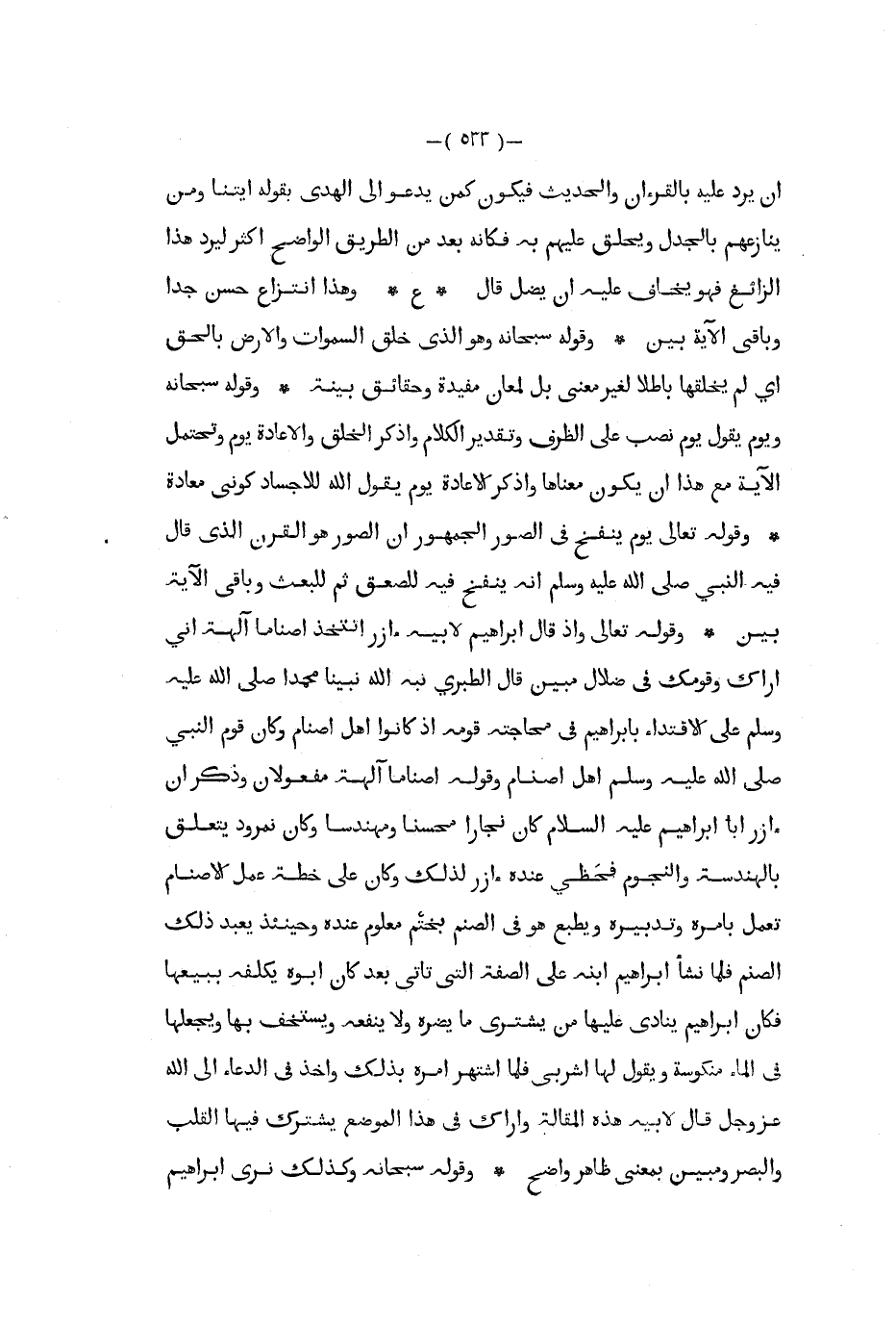 أن يرد عليه بالقرآن والحديث فيكون كمن يدعو إلى الهدى بقوله ايتنا ومن ينازعهم بالجدل ويحلق عليهم به فكأنه بعد من الطريق الواضح أكثر ليرد هذا الزائغ فهو يخاف عليه أن يضل قال ع وهذا انتزاع حسن جدا وباقي الآية بين وقوله سبحانه وهو الذي خلق السموات والأرض بالحق أي لم يخلقها باطلا لغير معنى بل لمعان مفيدة وحقائق بينة وقوله سبحانه ويوم يقول يوم نصب على الظرف وتقدير الكلام واذكر الخلق والإعادة يوم وتحتمل الآية مع هذا أن يكون معناها واذكر الإعادة يوم يقول الله للأجساد كوني معادة وقوله تعالى يوم ينفخ في الصور الجمهور أن الصور هو القرن الذي قال فيه النبي صلى الله عليه و سلم أنه ينفخ فيه للصعق ثم للبعث وباقي الآية بين وقوله تعالى وإذ قال إبراهيم لأبيه ءازر أتتخذ أصناما آلهة إني أراك وقومك في ضلال مبين قال الطبري نبه الله نبينا محمد صلى الله عليه و سلم على الاقتداء بإبراهيم في محاجته قومه إذ كانوا أهل أصنام وكان قوم النبي صلى الله عليه و سلم أهل أصنام وقوله أصناما آلهة مفعولان وذكر أن آزر أبا إبراهيم عليه السلام كان نجارا مسحنا ومهندسا وكان نمرود يتعلق بالهندسة والنجوم فحظي عنده آزر لذلك وكان على خطة عمل الأصنام تعمل بأمره وتدبيره ويطبع هو في الصنم بختم معلوم عنده وحينئذ يعبد ذلك الصنم فلما نشأ إبراهيم ابنه على الصفة التي تأتي بعد كان أبوه يكلفه ببيعها فكان إبراهيم ينادي عليها من يشتري ما يضره ولا ينفعه ويستخف بها ويجعلها في الماء منكوسة ويقول لها أشربي فلما اشتهر أمره بذلك وأخذ في الدعاء إلى الله عز و جل قال لأبيه هذه المقالة وأراك في هذا الموضع يشترك فيها القلب والبصر ومبين بمعنى ظاهر واضح وقوله سبحانه وكذلك نرى إبراهيم