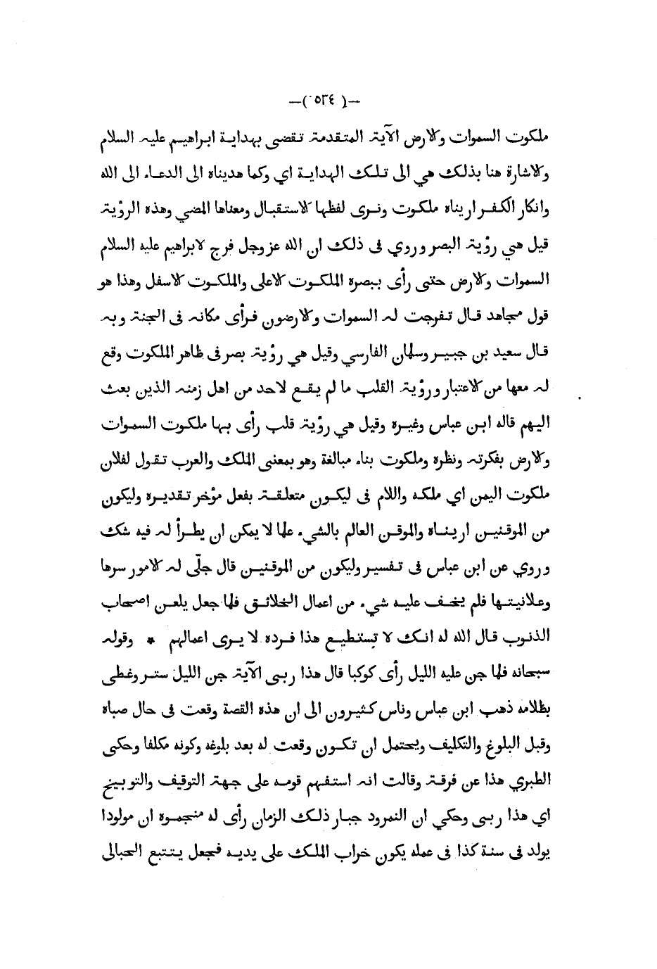 ملكوت السموات والأرض الآية المتقدمة تقضي بهداية إبراهيم عليه السلام والإشارة هنا بذلك هي إلى تلك الهداية أي وكما هديناه إلى الدعاء إلى الله وإنكار الكفر أريناه ملكوت ونرى لفظها الأستقبال ومعناها المضي وهذه الرؤية قيل هي رؤية البصر وروي في ذلك أن الله عز و جل فرج لإبراهيم عليه السلام السماوات والأرض حتى رأى ببصره الملكوت الأعلى والملكوت الأسفل وهذا هو قول مجاهد قال تفرجت له السماوات والأرضون فرأى مكانه في الجنة وبه قال سعيد بن جبير وسلمان الفارسي وقيل هي رؤية بصر في ظاهر الملكوت وقع له معها من الاعتبار ورؤية القلب ما لم يقع لأحد من أهل زمنه الذين بعث إليهم قاله ابن عباس وغيره وقيل هي رؤية قلب رأى بها ملكوت السماوات والأرض بفكرته ونظره وملكوت بناء مبالغة وهو بمعنى الملك والعرب تقول لفلان ملكوت اليمن أي ملكه واللام في ليكون متعلقة بفعل مؤخر تقديره وليكون من الموقنين أريناه والموقن العالم بالشيء علما لا يمكن أن يطرأ له فيه شك وروي عن ابن عباس في تفسير وليكون من الموقنين قاد جلى له الأمور سرها وعلانيتها فلم يخف عليه شيء من أعمال الخلائق فلما جعل يلعن أصحاب الذنوب قال الله له إنك لا تستطيع هذا فرده لا يرى أعمالهم وقوله سبحانه فلما جن عليه الليل رأى كوكبا قال هذا ربي الآية جن الليل ستر وغطى بظلامه ذهب ابن عباس وناس كثيرون إلى أن هذه القصة وقعت في حال صباه وقبل البلوغ والتكليف ويحتمل أن تكون وقعت له بعد بلوغه وكونه مكلفا وحكى الطبري هذا عن فرقة وقالت أنه استفهم قومه على جهة التوقيف والتوبيخ أي هذا ربي وحكي أن النمرود جبار ذلك الزمان رأى له منجموه أن مولودا يولد في سنة كذا في عمله يكون خراب الملك على يديه فجعل يتتبع الحبالى