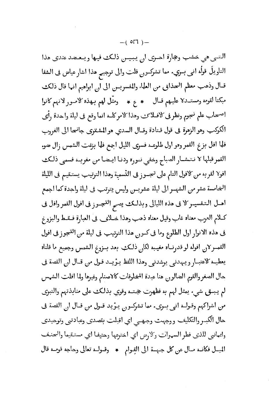 التي هي خشب وحجارة أحرى أن يبين ذلك فيها ويعضد عندي هذا التأويل قوله إني بريء مما تشكرون قلت وإلى ترجيح هذا أشار عياض في الشفا قال وذهب معظم الحذاق من العلماء والمفسرين إلى أن إبراهيم إنما قال ذلك مبكتا لقومه مستدلا عليهم قال ع ومثل لهم بهذه الأمور لأنهم كانوا أصحاب علم نجوم ونظر في الأفلاك وهذا الأمر كله إنما وقع في ليلة واحدة رأى الكوكب وهو الزهرة في قول قتادة وقال السدي هو المشتري جانحا إلى الغروب فلما أفل بزغ القمر وهو أول طلوعه فسرى الليل أجمع فلما بزغت الشمس زال ضوء القمر قبلها لإتنشار الصباح وخفي نوره ودنا أيضا من مغربه فسمي ذلك افولا لقربه من الأفوال التام على تجوز في التسمية وهذا الترتيب يستقيم في الليلة الخامسة عشر من الشهر إلى ليلة عشرين وليس يترتب في ليلة واحدة في واحد أهل التفسير إلا في هذه الليالي وبذلك يصح التجوز في افول القمر وافل في كلام العرب معناه غاب وقيل معناه ذهب وهذا خلاف في العبارة فقط والبزوغ في هذه الأنوار أول الطلوع وما في كون هذا الترتيب في ليلة من التجوز في أفول القمر لأن أفوله لو قدرناه مغيبه لكان ذلك عبد بزوغ الشمس وجميع ما قلناه يعطيه الاعتبار ويهدني يرشدني وهذا اللفظ يؤيد قول من قال أن القصة في حال الصغر والقوم الضالون هنا عبدة المخلوقات كالأصنام وغيرها ولما افلت الشمس لم ببق شيء يمثل لهم به فظهرت حجته وقوي بذلك على منابذتهم والتبري من أشراكهم وقوله إني بريء مما تشركون يؤيد قول من قال ان القصة في حال الكبر والتكليف ووجهت وجهي أي اقبلت بقصدي وعبادتي وتوحيدي وإيماني للذي فطر السموات والأرض أي اخترعها وحنيفا أي مستقيما والحنف الميل فكانه مال عن كل جهة إلى القوام وقوله تعالى وحاجة قومه قال