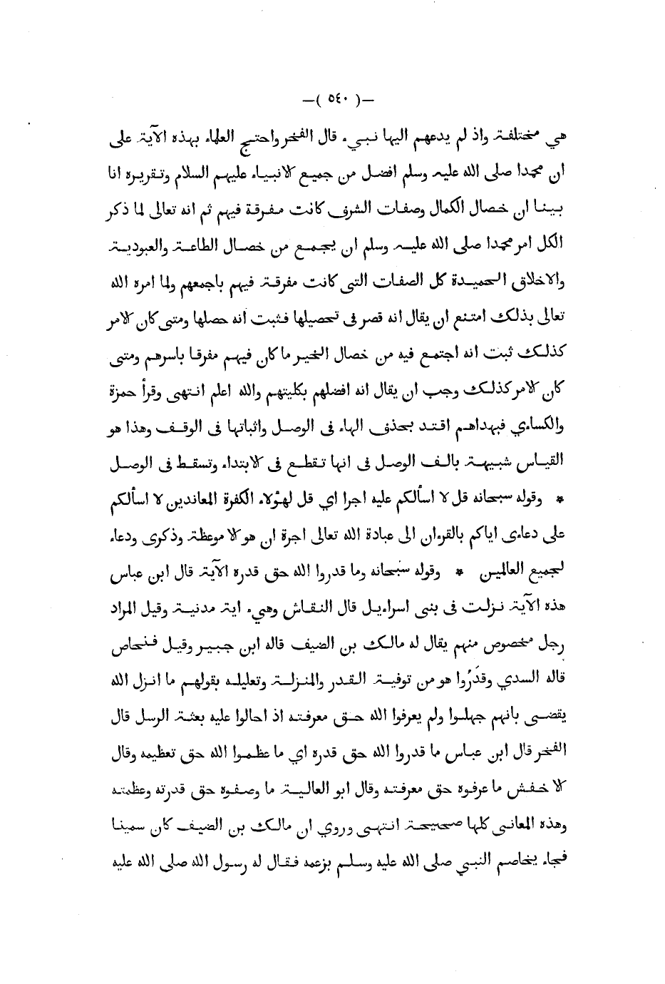 هي مختلفة وإذ لم يدعهم إليها نبي قال الفخر واحتج العلماء بهذه الاية على أن محمد صلى الله عليه و سلم أفضل من جميع الأنبياء عليهم السلام وتقريره انا بينا أن خصال الكمال وصفات الشرف كانت مفرقة فيهم ثم أنه تعالى لما ذكر الكل أمر محمد صلى الله عليه و سلم أن يجمع من خصال الطاعة والعبودية والأخلاق الحميدة كل الصفات التي كانت مفرقة فيهم بأجمعهم ولما أمره الله تعالى بذلك امتنع أن يقال أنه قصر في تحصيلها فثبت أنه حصلها ومتى كان الأمر كذلك ثبت أنه أجتمع فيه من خصال الخير ما كان فيهم مفرقا بأسرهم ومتى كان الأمر كذلك وجب أن يقال أنه أفضلهم بكليتهم والله أعلم انتهى وقرا حمزة والكسائي فبهداهم اقتدى بحذف الهاء في الوصل واثباتها في الوقف وهذا هو القياس شبيهة بألف الوصل في انها تقطع في الأبتداء وتسقط في الوصل وقوله سبحانه قل لا اسألكم عليه أجرا أي قل لهؤلاء الكفرة المعاندين لا أسألكم على دعائي إياكم بالقرآن إلى عبادة الله تعالى أجرة إن هو إلا موعظة وذكرى ودعاء لجميع العالمين وقوله سبحانه وما قدروا الله حق قدره الآية قال ابن عباس هذه الآية نزلت في بني إسرائيل قال النقاش وهي آية مدنية وقيل المراد رجل مخصوص منهم يقال له مالك بن الضيف قاله ابن جبير وقيل فنحاص قاله السدي وقدروا هو من توفية القدر والمنزلة وتعليله بقولهم ما أنزل الله يقضي بأنهم جهلوا ولم يعرفوا الله حق معرفته إذ أحالوا عليه بعثة الرسل قال الفخر قال ابن عباس ما قدروا الله حق قدره أي ما عظموا الله حق تعظيمه وقال الأخفش ما عرفوه حق معرفته وقال أبو العالية ما وصفوه حق قدرته وعظمته وهذه المعانى كلها صحيحة انتهى وروي أن مالك بن الضيف كان سمينا فجاء يخاصم النبي صلى الله عليه و سلم بزعمه فقال له رسول الله صلى الله عليه