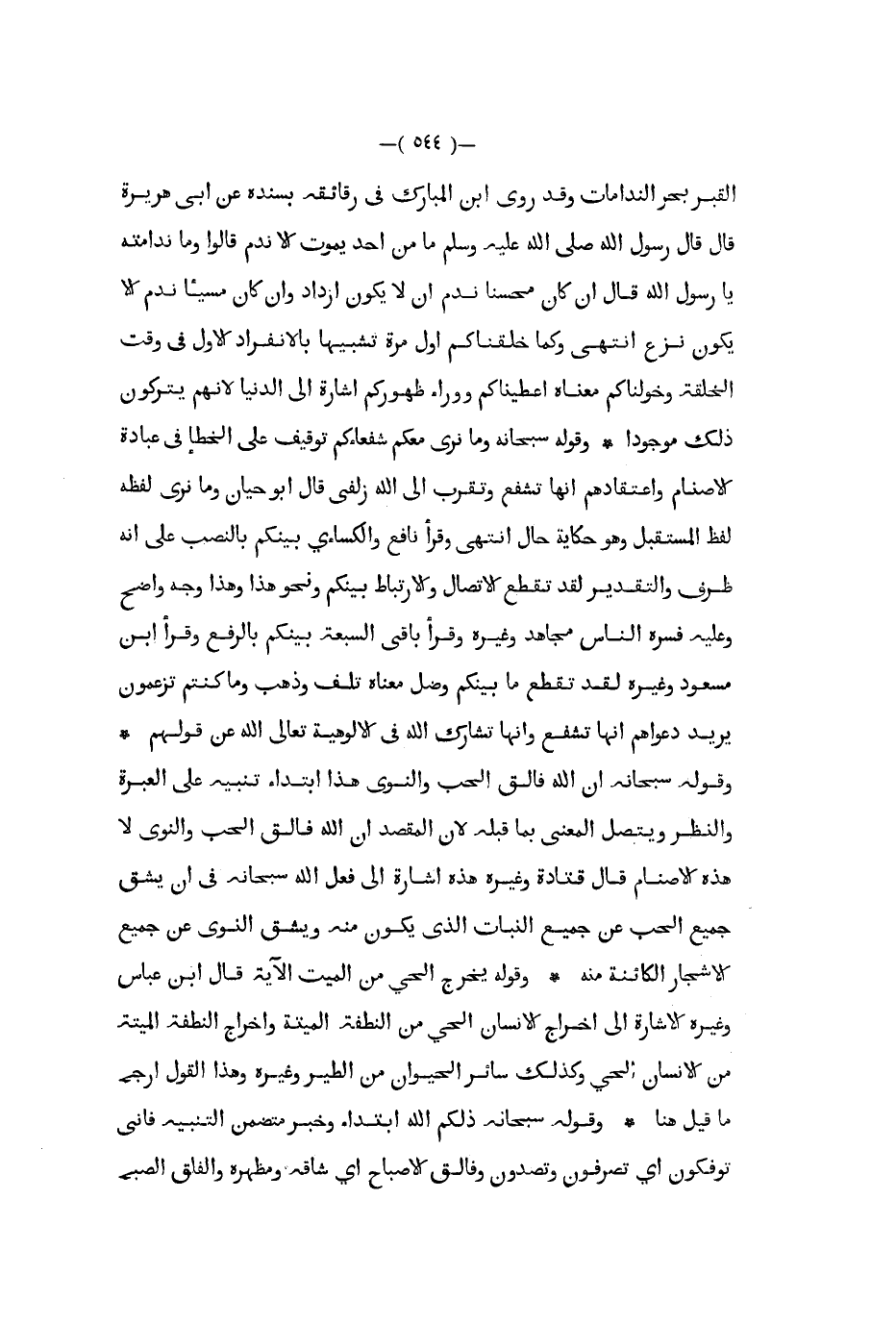القبر بحر الندامات وقد روى أبن المبارك في رقائقه بسنده عن أبي هريرة قال قال رسول الله صلى الله عليه و سلم ما من أحد يموت إلا ندم قالوا وما ندامته يا رسول الله قال إن كان محسنا ندم أن لا يكون ازداد وان كان مسيئا ندم الا يكون نزع انتهى وكما خلقناكم أول مرة تشبيها بالانفراد الأول في وقت الخلقة وخولناكم معناه أعطيناكم ووراء ظهوركم إشارة إلى الدنيا لأنهم يتركون ذلك موجودا وقوله سبحانه وما نرى معكم شفعاءكم توقيف على الخطا في عبادة الأصنام واعتقادهم أنها تشفع وتقرب إلى الله زلفى قال أبو حيان وما نرى لفظه لفظ المستقبل وهو حكاية حال انتهى وقرأ نافع والكساءي بينكم بالنصب على أنه ظرف والتقدير لقد تقطع الاتصال والارتباط بينكم ونحو هذا وهذا وجه واضح وعليه فسره الناس مجاهد وغيره وقرأ باقي السبعه بينكم بالرفع وقرأ ابن مسعود وغيره لقد تقطع ما بينكم وضل معناه تلف وذهب وما كنتم تزعمون يريد دعواهم أنها تشفع وأنها تشارك الله في الألوهية تعالى الله عن قولهم وقوله سبحانه ان الله فالق الحب والنوى هذا ابتداء تنبيه على العبرة والنظر ويتصل المعنى بما قلبله لأن المقصد أن الله فالق الحب والنوى لا هذه الأصنام قال قتادة وغيره هذه إشارة إلى فعل الله سبحانه في أن يشق جميع الحب عن جميع النبات الذي يكون منه ويشق النوى عن جميع الأشجار الكائنة منه وقوله يخرج الحي من الميت الآية قال ابن عباس وغيره الاشارة الى اخراج الانسان الحي من النطفة الميته وإخراج النطفة المتية من الإنسان الحي وكذلك سائر الحيوان من الطير وغيره وهذا القول أرجح ما قيل هنا وقوله سبحانه ذلكم الله ابتداء وخبر متضمن التنبيه فإنى تؤفكون أي تصرفون وتصدون وفالق الأصباح أي شاقه ومظهره والفلق الصبح