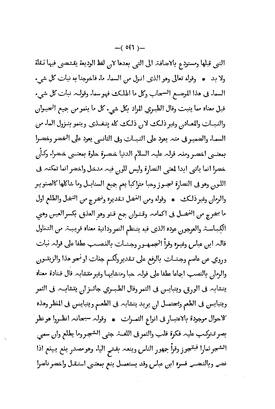 التي قبلها ومستودع بالإضافة إلى التي بعدها لأن لفظ الوديعة يقتضي فيها نقلة ولا بد وقوله تعالى وهوالذي أنزل من السماء ماء فأخرجنا به نبات كل شيء السماء في هذا الموضع السحاب وكل ما اظلك فهو سماء وقوله نبات كل شيء قيل معناه مما ينبت وقال الطبري المراد بكل شيء كل ما ينمو من جميع الحيوان والنبات والمعادن وغير ذلك لأن ذلك كله يتغدى وينمو بنزول الماء من السماء والضمير في منه يعود على النبات وفي الثاني يعود على الخضر وخضرا بمعنى أخضر ومنه قوله عليه السلام الدنيا خضرة حلوة بمعنى خضراء وكأن خضرا إنما يأتي ابدا لمعنى النضارة وليس للون فيه مدخل وأخضر إنما تمكنه في اللون وهو في النضارة تجوز وحبا متراكبا يعم جيمع السنابل وما شاكلها كالصنوبر والرمان وغير ذلك وقوله ومن النخل تقديره ونخرج من النخل الطلع أول ما يخرج من النخل في أكمامه وقنوان جمع قنو وهوالعذق بكسر العين وهي الكباسة والعرجون عوده الذي فيه ينتظم التمر ودانية معناه قريبة من التناول قاله ابن عباس وغيره وقرأ الجمهور وجنات بالنصب عطفا على قوله نبات وروي عن عاصم وجنات بالرفع على تقدير ولكم جنات أو نحو هذا والزيتون والرمان بالنصب إجماعا عطفا على قوله حبا ومتشابها وغير متشابه قال قتادة معناه يتشابه في الورق ويتباين في الثمر وقال الطبري جائز أن يتشابه في الثمر ويتباين في الطعم ويحتمل أن يريد يتشابه في الطعم ويتباين في المنظر وهذه الأحوال موجودة بالاعتبار في أنواع الثمرات وقوله سبحانه انظروا هونظر بصر تتركب عليه فكرة قلب والثمر في اللغة جنى الشجر وما يطلع وأن سمي الشجر ثمارا فبتجوز وقرأ جمهور الناس وينعه بفتح الياء وهومصدر ينع يينع إذا نضج وبالنضج فسره ابن عباس وقد يستعمل ينع بمعنى استقل وأخضر ناضرا