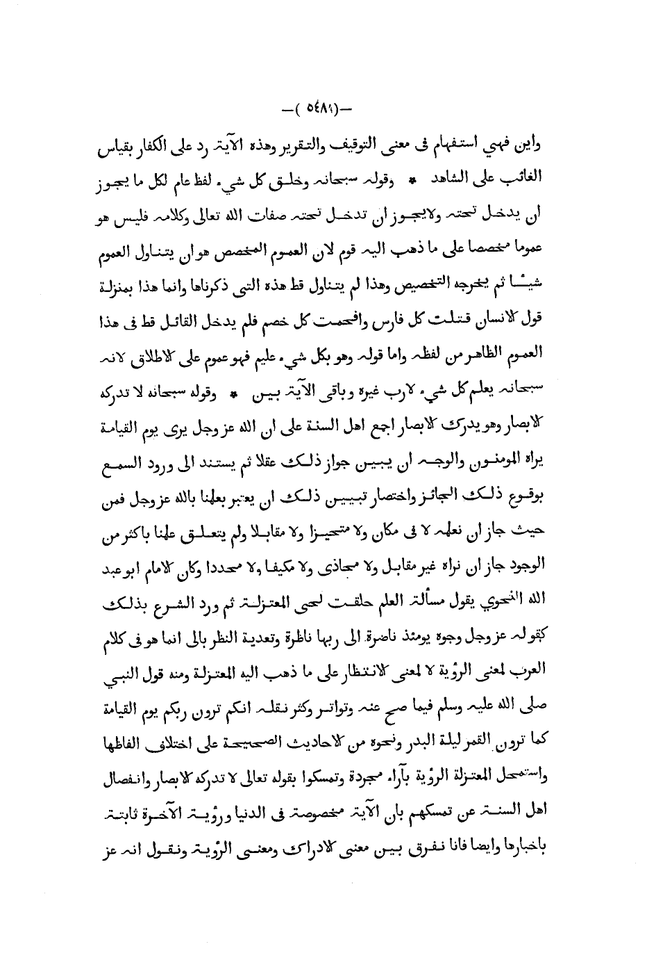 واين فهي استفهام في معنى التوقيف والتقرير وهذه الآية رد على الكفار بقياس الغائب على الشاهد وقوله سبحانه وخلق كل شيء لفظ عام لكل ما يجوز أن يدخل تحته ولا يجوز أن تدخل تحته صفات الله تعالى وكلامه فليس هو عموما مخصصا على ما ذهب إليه قوم لأن العموم المخصص هو أن يتناول العموم شيئا ثم يخرجه التخصيص وهذا لم يتناول قط هذه التي ذكرناها وإنما هذا بمنزلة قول الإنسان قتلت كل فارس وافحمت كل خصم فلم يدخل القائل قط في هذا العموم الظاهر من لفظه وأما قوله وهو بكل شيء عليم فهو عموم على الإطلاق لأنه سبحانه يعلم كل شيء لا رب غيره وباقي الآية بين وقوله سبحانه لا تدركه الأبصار وهو يدرك الأبصار أجمع أهل السنة على أن الله عز و جل يرى يوم القيامة يراه المؤمنون والوجه أن يبين جواز ذلك عقلا ثم يستند إلى ورود السمع بوقوع ذلك الجائز واختصار تبيين ذلك ان يعتبر بعلمنا بالله عز و جل فمن حيث جاز أن نعلمه لا في مكان ولا متحيزا ولا مقابلا ولم يتعلق علمنا بأكثر من الوجود جاز أن نراه غير مقابل ولا مجاذي ولا مكيفا ولا محددا وكان الإمام أبوعبد الله النحوي يقول مسألة العلم حلقت لحى المعتزلة ثم ورد الشرع بذلك كقوله عز و جل وجوه يومئذ ناضرة إلى ربها ناظرة وتعدية النظر بإلى إنما هو في كلام العرب لمعنى الرؤية لا لمعنى الانتظار على ما ذهب إليه المعتزلة ومنه قول النبي صلى الله عليه و سلم فيما صح عنه وتواتر وكثر نقله أنكم ترون ربكم يوم القيامة كا ترون القمر ليلة البدر ونحوه من الأحاديث الصحيحة على اختلاف ألفاظها واستمحل المعتزلة الرؤية بآراء مجردةوتمسكوا بقوله تعالى لا تدركه الأبصار وانفصال اهل السنة عن تمسكهم بأن الآية مخصوصة في الدنيا ورؤية الآخرة ثابتة بأخبارها وأيضا فانا نفرق بين معنى الإدراك ومعنى الرؤية ونقول أنه عز