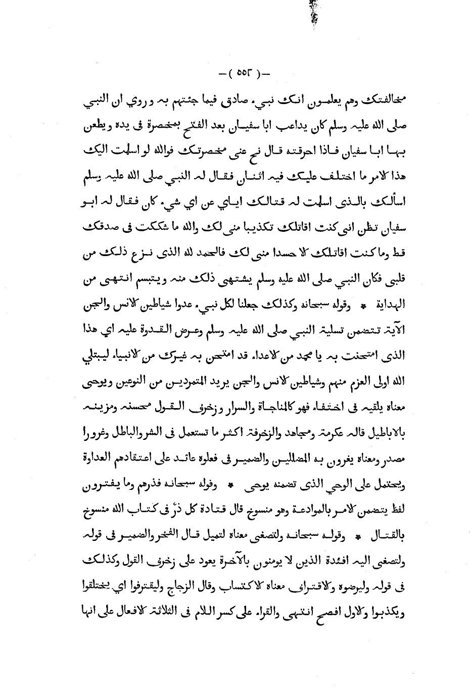 مخالفتك وهم يعلمون أنك نبيء صادق فيما جئتهم به وروي أن النبي صلى الله عليه و سلم كان يداعب أبا سفيان بعد الفتح بمخصرة في يده ويطعن بها أبا سفيان فإذا أحرقته قال نح عني مخصرتك فوالله لو أسلمت إليك هذا الأمر ما اختلف عليك فيه اثنان فقال له النبي صلى الله عليه و سلم أسألك بالذي أسلمت له قتالك إياي عن أي شيء كان فقال له أبو سفيان تظن أني كنت أقاتلك تكذيبا مني لك والله ما شككت في صدقك قط وما كنت أقاتلك إلا حسدا مني لك فالحمد لله الذي نزع ذلك من قلبي فكان النبي صلى الله عليه و سلم يشتهي ذلك منه ويتبسم انتهى من الهداية وقوله سبحانه وكذلك جعلنا لكل نبيء عدوا شياطين الانس والجن الآية تتضمن تسلية النبي صلى الله عليه و سلم وعرض القدوة عليه أي هذا الذي امتحنت به يا محمد من الأعداء قد امتحن به غيرك من الأنبياء ليبتلي الله أولى العزم منهم وشياطين الإنس والجن يريد المتمردين من النوعين ويوحى معناه يلقيه في اختفاء فهو كالمناجاة والسرار وزخرف القول محسنه ومزينه بالأباطيل قاله عكرمة ومجاهد والزخرفة أكثر ما تستعمل في الشر والباطل وغرورا مصدر ومعناه يغرون به المضللين والضمير في فعلوه عائد على اعتقادهم العداوة ويحتمل على الوحي الذي تمضنه يوحى وقوله سبحانه فذرهم وما يفترون لفظ يتضمن الأمر بالموادعة وهو منسوخ قال قتادة كل ذر في كتاب الله منسوخ بالقتال وقوله سبحانه ولتصغى معناه لتميل قال الفخر والضمير في قوله ولتصغى إليه افئدة الذين لا يؤمنون بالآخرة يعود على زخرف القول وكذلك في قوله وليرضوه والإقتراف معناه الإكتساب وقال الزجاج وليقترفوا أي يختلقوا ويكذروا والأول أفصح انتهى والقراء على كسر اللام في الثلاثة الأفعال على أنها