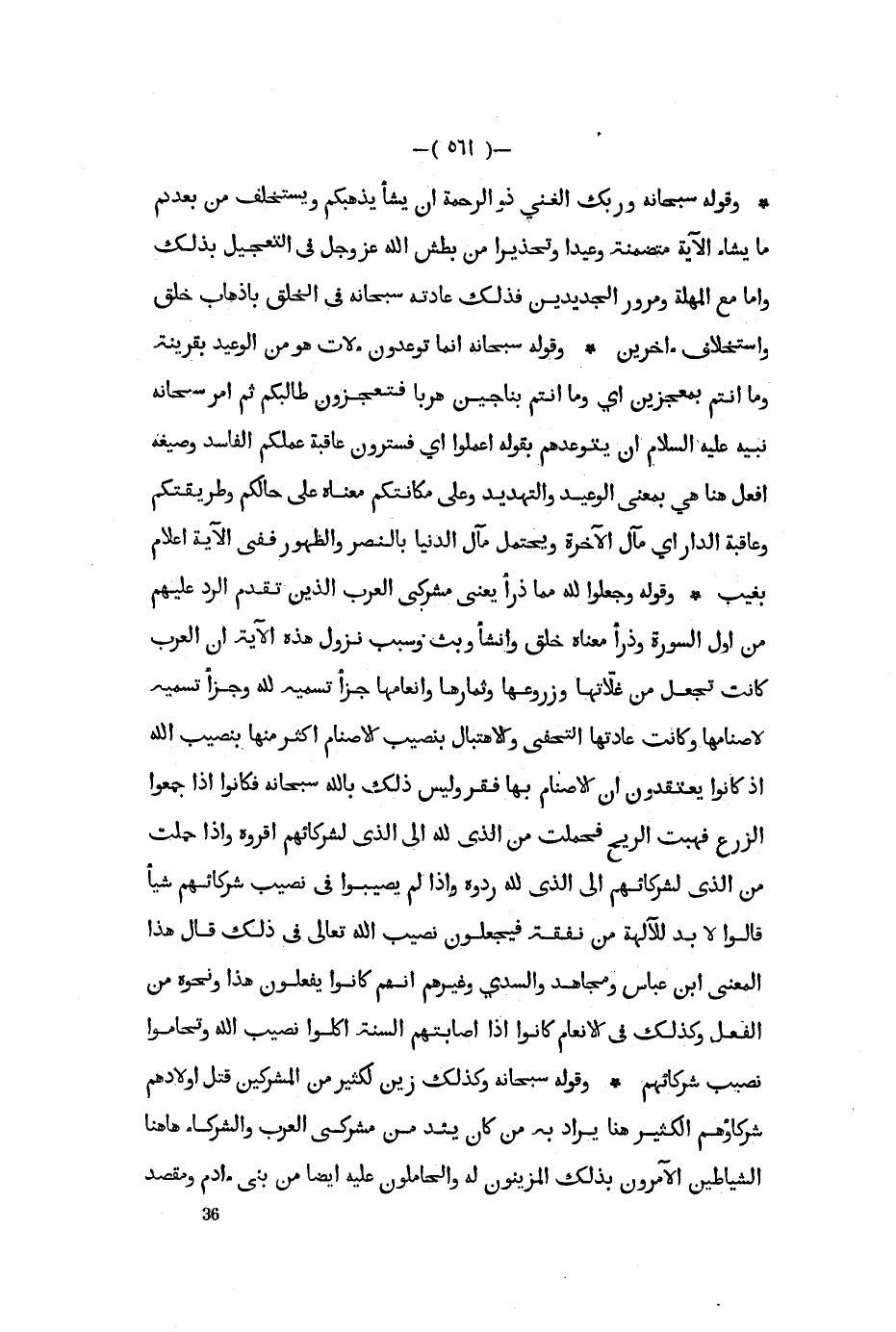 وقوله سبحانه وربك الغني ذو الرحمة أن يشأ يذهبكم ويستخلف من بعدهم ما يشاء الآية مضمنة وعيدا وتحذيرا من بطش الله عز و جل في التعجيل بذلك وأما مع المهلة ومرور الجديدين فذلك عادته سبحانه في الخلق باذهاب خلق واستخلاف آخرين وقوله سبحانه إنما توعدون ءلات هو من الوعيد بقرينة وما أنتم بمعجزين أي وما أنتم بناجين هربا فتعجزون طالبكم ثم أمر سبحانه نبيه عليه السلام أن يتوعدهم بقوله اعملوا أي فسترون عاقبة عملكم الفاسد وصيغة افعل هنا هي بمعنى الوعيد والتهديد وعلى مكانتكم معناه على حالكم وطريقتكم وعاقبة الدار أي مآل الآخرة ويحتمل مآل الدنيا بالنصر والظهور ففي الآية إعلام بغيب وقوله وجعلوا لله مما ذرأ يعني مشركي العرب الذين تقدم الرد عليهم من أول السورة وذرأ معناه خلق وأنشأ وبث وسبب نزول هذه الآية أن العرب كانت تجعل من غلاتها وزروعها وثمارها وأنعامها جزأ تسمية لله وجزأ تسمية لأصنامها وكانت عادتها التحفي والاهتبال بنصيب الأصنام أكثر منها بنصيب الله إذ كانوا يعتقدون أن الأصنام بها فقر وليس ذلك بالله سبحانه فكانوا إذا جمعوا الزرع فهبت الريح فحملت من الذي لله إلىالذي لشركائهم أقروه وإذا حملت من الذي لشركائهم إلى الذي لله ردوه وإذا لم يصيبوا في نصيب شركائهم شيئا قالوا لا بد للآلهة من نفقة فيجعلون نصيب الله تعالى في ذلك قال هذا المعنى ابن عباس ومجاهد والسدي وغيرهم انهم كانوا يفعلون هذا ونحوه من الفعل وكذلك في الأنعام كانوا إذا أصابتهم ألسنة أكلوا نصيب الله وتحاموا نصبب شركائهم وقوله سبحانه وكذلك زين لكثير من المشركين قتل أولادهم شركاؤهم الكثير هنا يراد به من كان يئد من شركي العرب والشركاء هاهنا الشياطين الآمرون بذلك المزينون له والحاملون عليه أيضا من بني آدم ومقصد