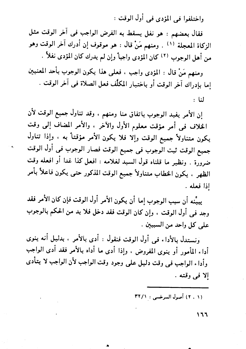 إن الأمر يفيد الوجوب باتفاق مننا ومنهم، وقد تناول جميع الوقت لأن الخلاف في أمر مؤقت معلوم الأول والآخر، والأمر المضاف إلى وقت يكون متناولاً جميع الوقت وإلا فلا يكون الأمر مؤقتاً، وإذا تناول جميع الوقت ثبت الوجوب في جميع الوقت فصار الوجوب في أول الوقت ضرورة. ونظير ما قلناه قول السيد لغلامه: افعل كذا غداً أو افعله وقت الظهر، يكون الخطاب متناولاً جميع الوقت المذكور حتى يكون فاعلاً بأمر إذا فعله.
