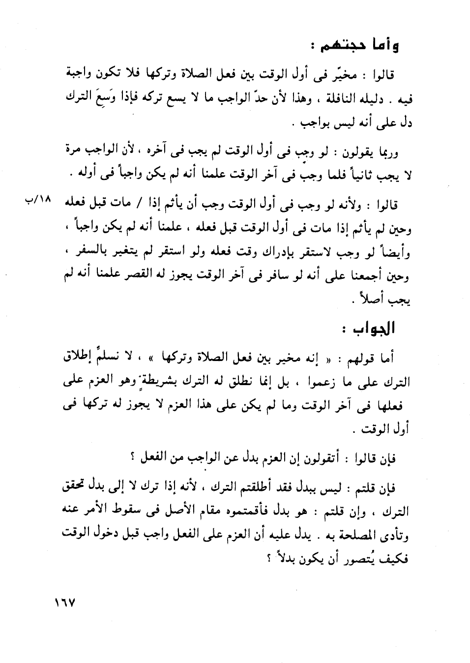 أما قولهم: ((إنه مخير بين فعل الصلاة وتركها))، لا نسلم إطلاق الترك على ما زعموا، بل إنما نطلق له الترك بشريطة وهو العز على فعلها في آخر الوقت وما لم يكن على هذا العزم لا يجوز له تركها في أول الوقت.
