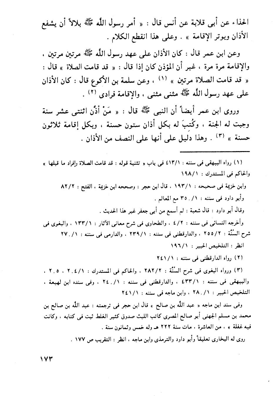 وعن ابن عمر قال: كان الأذان على عهد رسول الله - صلى الله عليه وسلم - مرتين مرتين، والإقامة مرة مرة، غير أن المؤذن كان إذا قال: ((قد قامت الصلاة)) قال: ((قد قامت الصلاة مرتين))، وعن سلمة بن الأكوع قال: كان الأذان على عهد رسول الله - صلى الله عليه وسلم - مثنى مثنى، والإقامة فرادى.