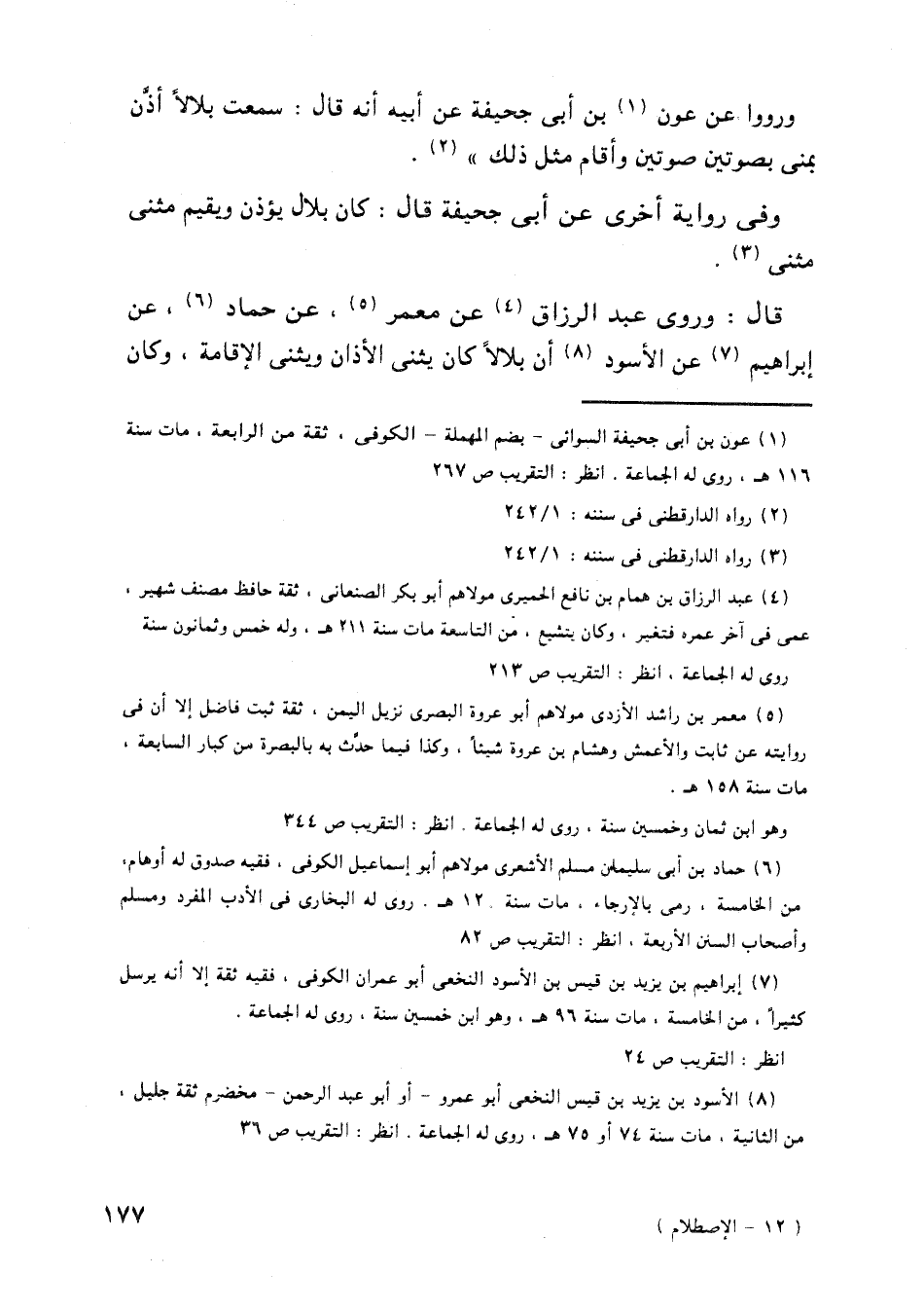 قال: وروى عبد الرازق عن معمر، عن حماد، عن إبراهيم عن الأسود أن بلالاً كان يثنى الأذان ويثنى الإقامة، وكان