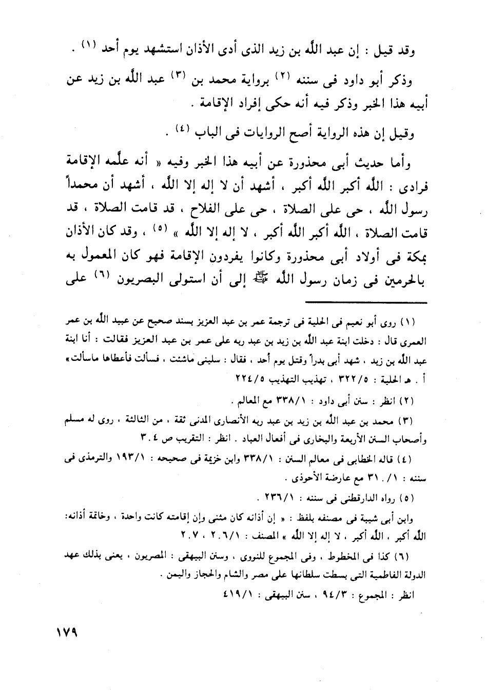 وذكر أبو دا ود في سننه برواية محمد بن عبد الله بن زيد عن أبيه هذا الخبر وذكر فيه أنه حكى إفراد الإقامة.