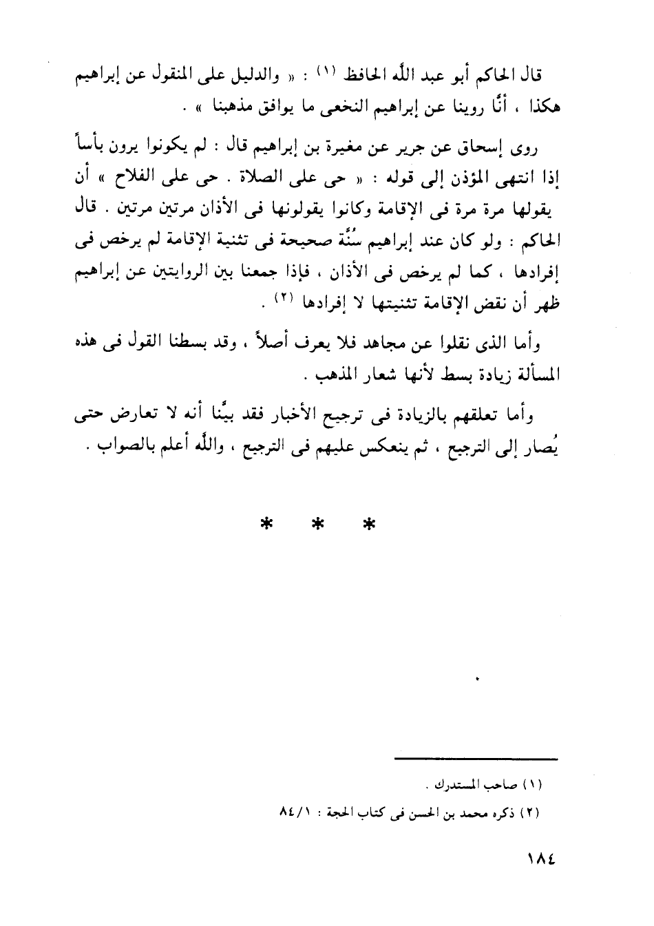 روى إسحاق عن جرير عن مغيرة بن إبراهيم قال: لم يكونوا يرون بأساً إذا انتهى المؤذن إلى قوله: ((حى على الصلاة، حى على الفلاح)) أن يقولها مرة مرة في الإقامة وكانوا يقولونها في الأذان مرتين مرتين. قال الحاكم: ول كان عند إبراهيم سنة صحيحة في تثنية الإقامة لم يرخص في إفرادها، كما لو يرخص في الأذان، فإذا جمعنا بين الروايتين عن إبراهيم ظهر أن نقض الإقامة تثنيتها لا إفرادها.