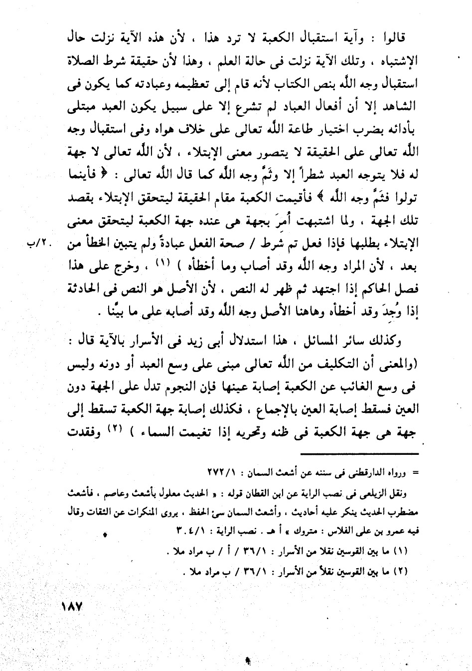 وكذلك سائر المسائل، هذا استدلال أبي زيد في الأسرار بالآية قال: (والمعنى أن التكليف من الله تعالى مبنى على وسع العبد أو دونه وليس في وسع الغائب عن الكعبة إصابة عينها فإن النجوم تدل على الجهة دون العين فسقط إصابة العين بالإجماع، فكذلك إصابة جهة الكعبة تسقط إلى جهة الكعبة في ظنه وتحريه إذا تغيمت السماء) وفقدت
