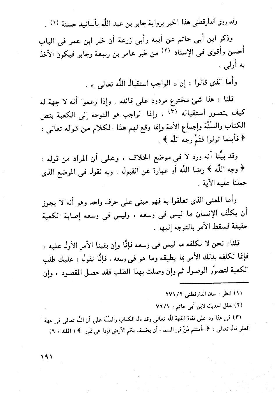 قلنا: هذا شيء مخترع مردود على قائله. وإذا زعموا أنه لا جهة له كيف يتصور استقباله، وإنما الواجب هـ التوجه إلى الكعبة بنص الكتاب والسنة وإجماع الأمة وإنما وقع لهم هذا الكلام من قوله تعالى: {فَأَيْنَمَا تُوَلُّوا فَثَمَّ وَجْهُ اللَّهِ}.