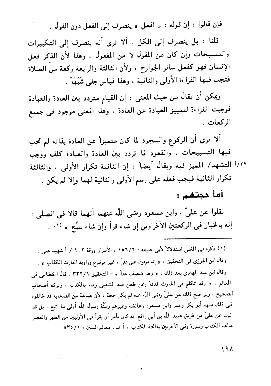 قلنا: بل ينصرف إلى الكل. ألا ترى أنه ينصرف إلى التكبيرات والتسبيحات وإن كان من المقول لا من المفعول، وهذا لأن الذكر فعل الإنسان فهو كفعل سائر الجوارح، ولأن الثالثة والرابعة ركعة من الصلاة فتجب فيها القراءة الأولى والثانية، وهذا قياس جلي شبهاً.