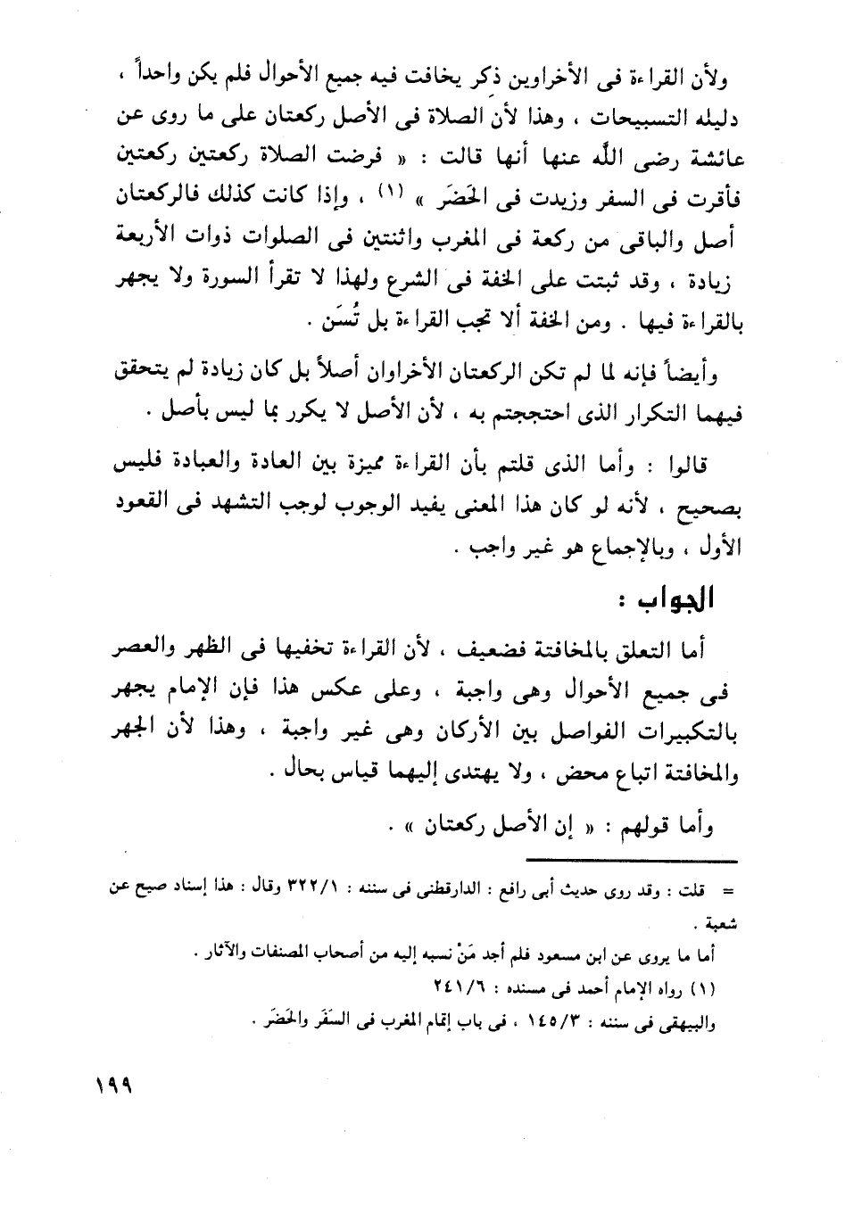 وأيضاً فإنه لما لم تكن الركعتان الأخراوان أصلاً بل كان زيادة لم يتحقق فيهما التكرار الذي احتججتم به، لأن الأصل لا يكرر بما ليس بأصل.