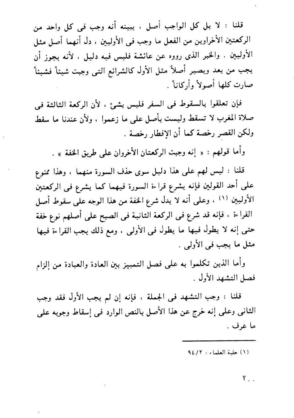 قلنا: ليس لهم على هذا دليل سوى حذف السورة منهما، وهذا ممنوع على أحد القولين فإنه يشرع قراءة السورة فيهما كما يشرع في الركعتين الأوليين، وعلى أنه لا يدل شرع الخفة من هذا الوجه على سقوط أصل القراءة، فإنه قد شرع في الركعة الثانية في الصبح على أصلهم نوع خفة حتى إنه لا يطول فيها ما يطول في الأولى، ومع ذلك يجب القراءة فيها مثل ما يجب في الأولى.