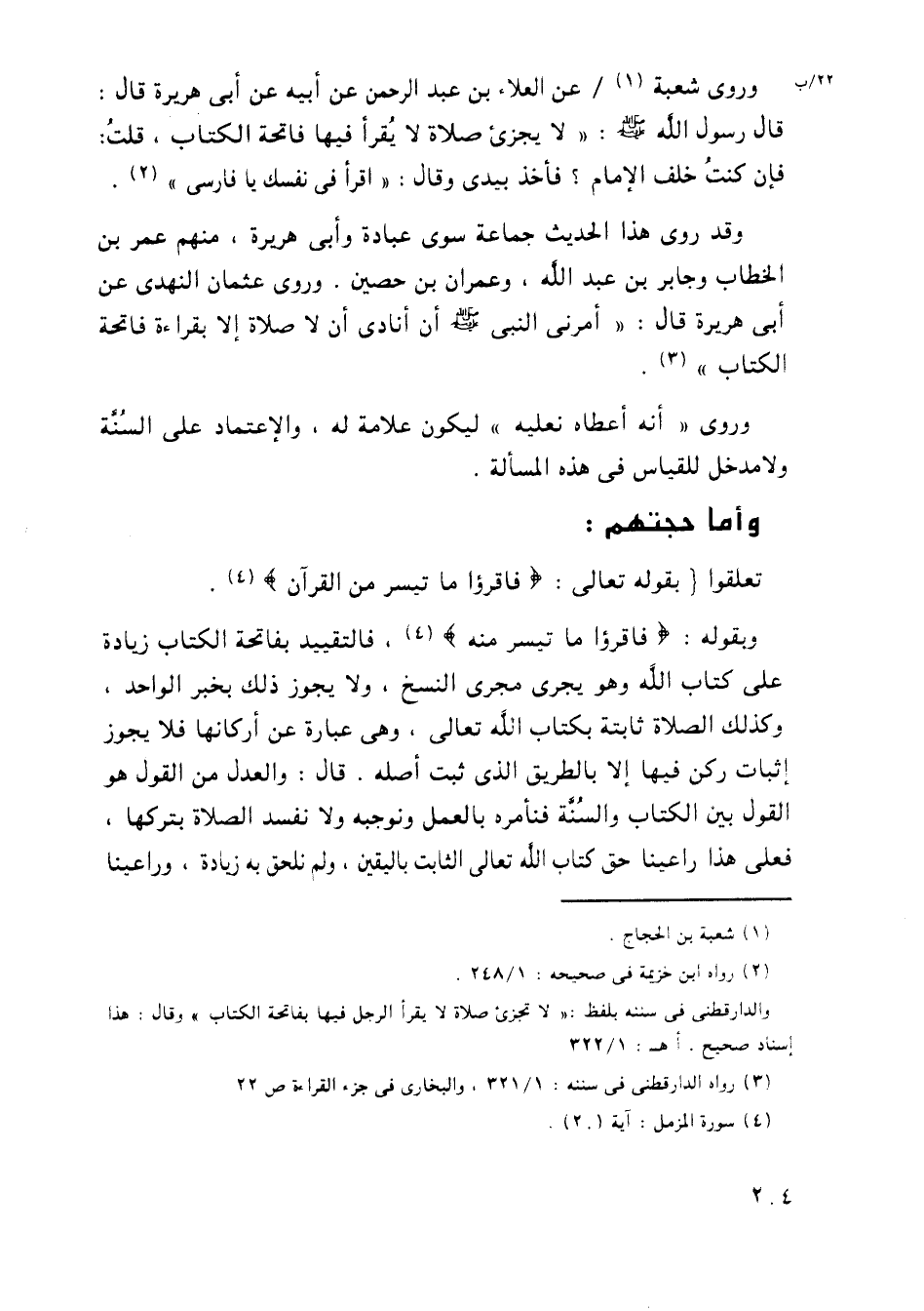 وبقوله: {فَاقْرَءُوا مَا تَيَسَّرَ مِنَه}، فالتقييد بفاتحة الكتاب زيادة على كتاب الله وهو يجري مجرى النسخ، ولا يجوز بخبر الواحد، وكذلك الصلاة ثابتة بكتاب الله تعالى، وهي عبارة عن أركانها فلا يجوز إثبات ركن فيها إلا بالطريق الذي ثبت أصله. قال: والعدل من القول هو القول بين الكتاب والسنة فنأمره بالعمل ونوجبه ولا نفسد الصلاة بتركها، فعلى هذا راعينا حق كتاب الله تعالى الثابت باليقين، ولم نلحق به زيادة، وراعينا
