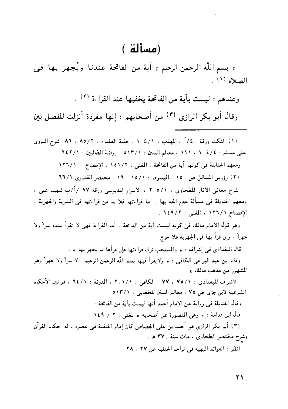 ((بسم الله الرحمن الرحيم)) آية من الفاتحة عندنا ويجهر بها في الصلاة.
