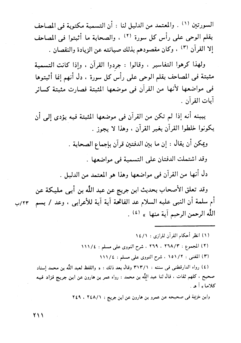 ولهذا كرهوا التفاسير، وقالوا: جردوا القرآن، وإذا كانت التسمية مثبتة في المصاحف بقلم الوحي على رأس كل سورة، دل أنهم إنما أثبتوها في مواضعها لأنها من القرآن في موضعها المثبتة فصارت مثبتة كسائر آيات القرآن.