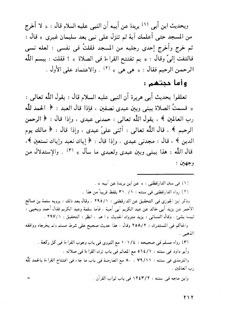 تعلقوا بحديث أبي هريرة أن النبي عليه السلام قال: يقول الله تعالى: ((قسمت الصلاة بيني وبين عبدي نصفين، فإذا قال العبد: {الْحَمْدُ لِلَّهِ رَبِّ الْعَالَمِينَ}، يقول الله تعالى: حمدني عبدي، وإذا قال: {الرَّحْمَانِ الرَّحِيمِ}، قال الله تعالى: أثنى على عبدي، وإذا قال: {مَالِكِ يَوْمِ الدِّينِ}، قال: مجدني عبدي، وإذا قال: {إِيَّاكَ نَعْبُدُ وَإِيَّاكَ نَسْتَعِينُ}، قال الله: هذا بيني وبين عبدي ولعبدي ما سأل)). والاستدلال من وجهين: