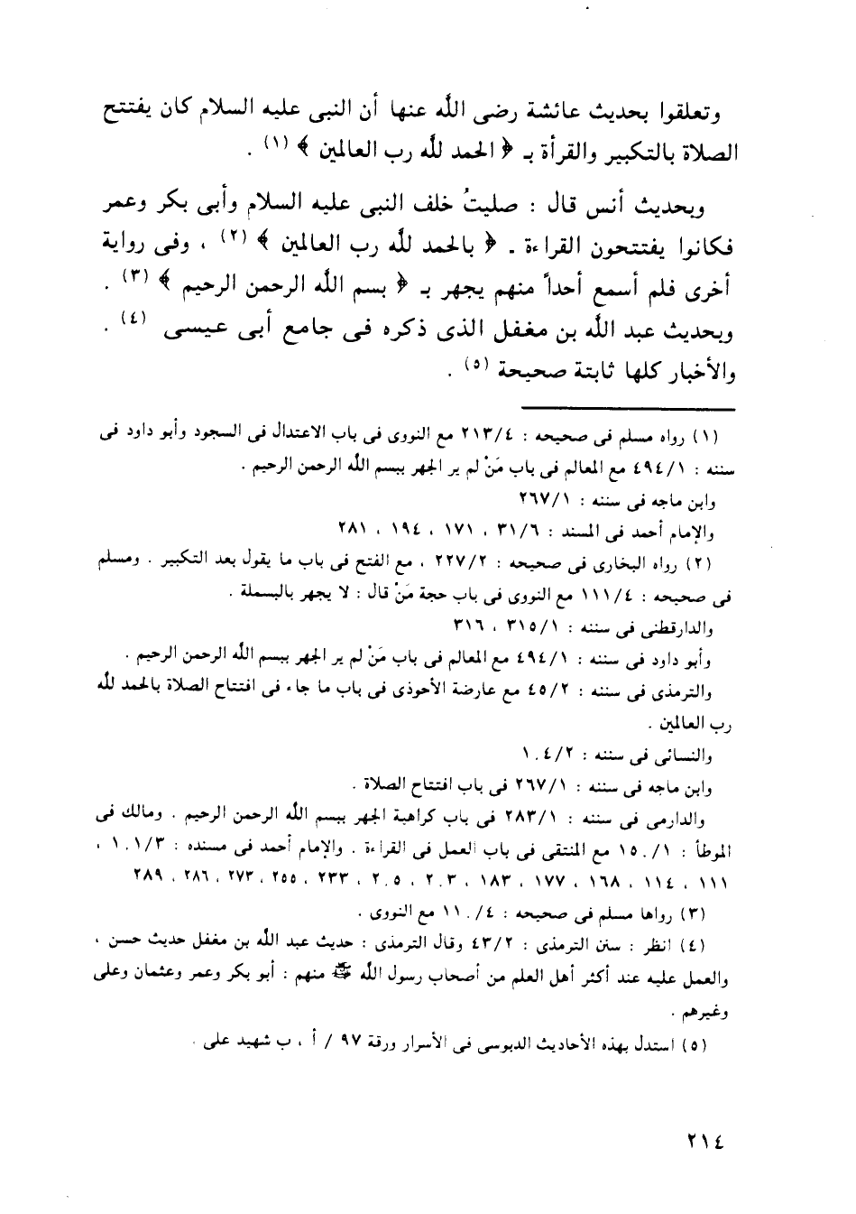 وبحديث أنس قال: صليت خلف النبي عليه السلام وأبي بكر وعمر فكانوا يفتتحون القراءة {بالْحَمْدُ لِلَّهِ رَبِّ الْعَالَمِينَ}، وفي رواية أخرى فلم أسمع أحداً منهم يجهر بـ {بسم الله الرحمن الرحيم}. وبحديث عبد الله بن مغفل الذي ذكره في جامع أبي عيسى والأخبار كلها ثابتة صحيحة.