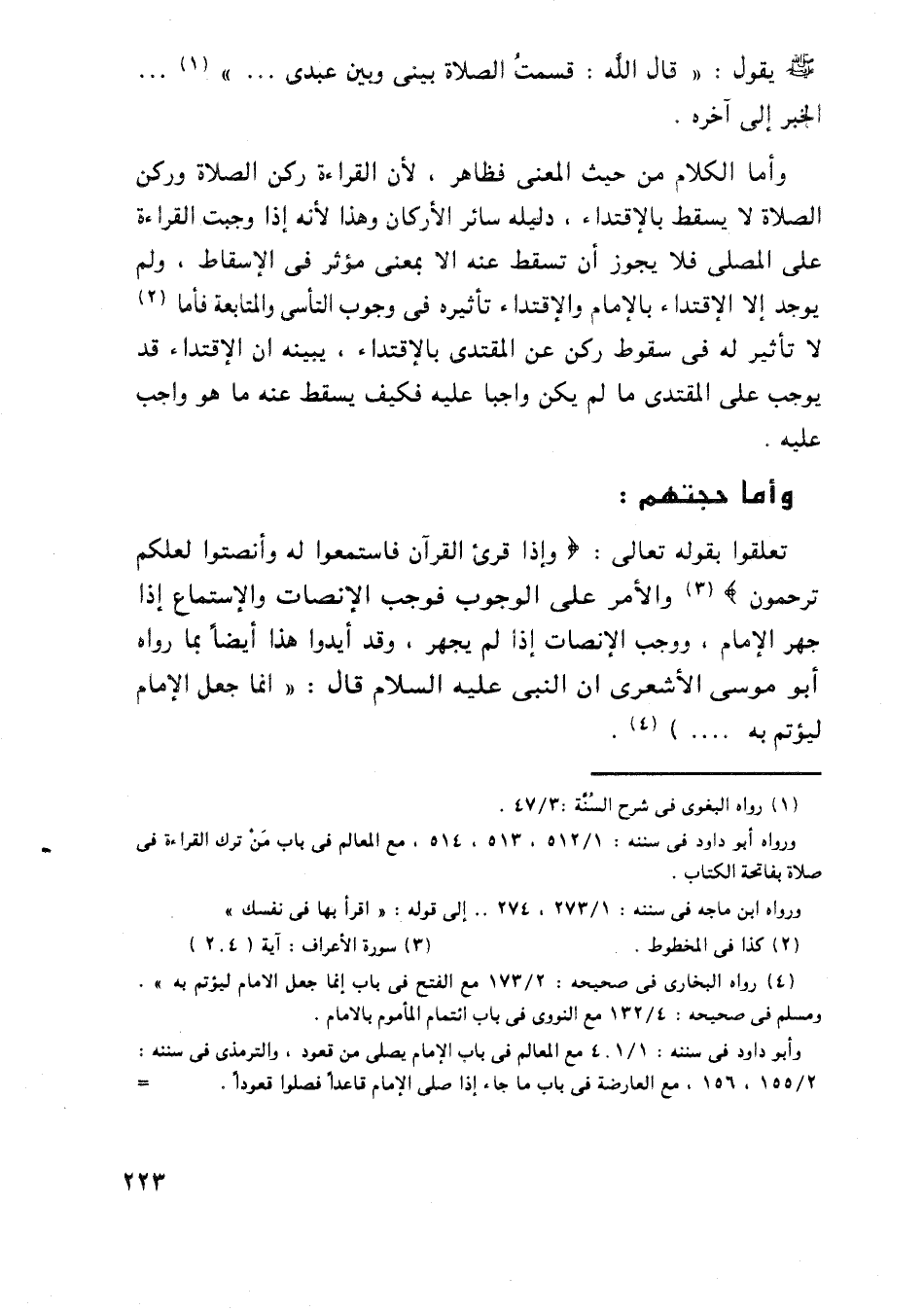 تعلقوا بقوله تعالى: {وَإِذَا قُرِئَ الْقُرْآنُ فَاسْتَمِعُوا لَهُ وَأَنْصِتُوا لَعَلَّكُمْ تُرْحَمُونَ} والأمر على الوجوب فوجب الإنصات والاستماع إذا جهر الإمام، ووجب الإنصات إذا لم يجهر، وقد أيدوا هذا أيضاً بما رواه أبو موسى الأشعري أن النبي عليه السلام قال: ((إنما جعل الإمام ليؤتم به ....).