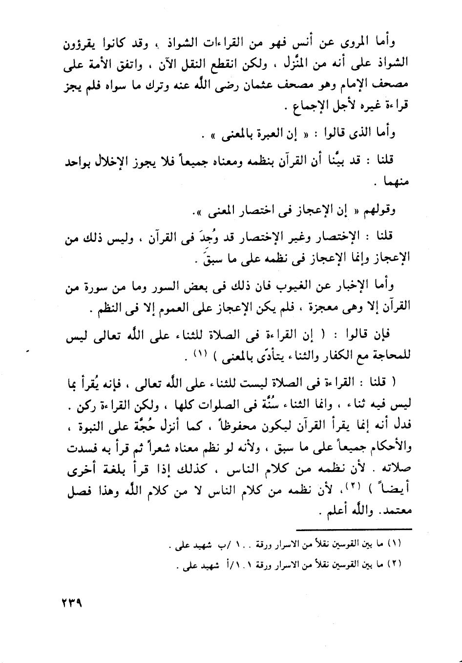 (قلنا: القراءة في الصلاة ليست للثناء على الله تعالى، فإنه يقرأ بما ليس فيه ثناء، وإنما الثناء سنة في الصلوات كلها، ولكن القراءة ركن. فدل أنه إنما يقرأ القرآن ليكون محفوظاً، كما أنزل حجة على النبوة، والأحكام جميعاً على ما سبق، ولأنه لو نظم معناه شعراً ثم قرأ به فسدت صلاته. لأنه نظمه من كلام الناس لا من كلام الله وهذا فصل معتمد. والله أعلم.