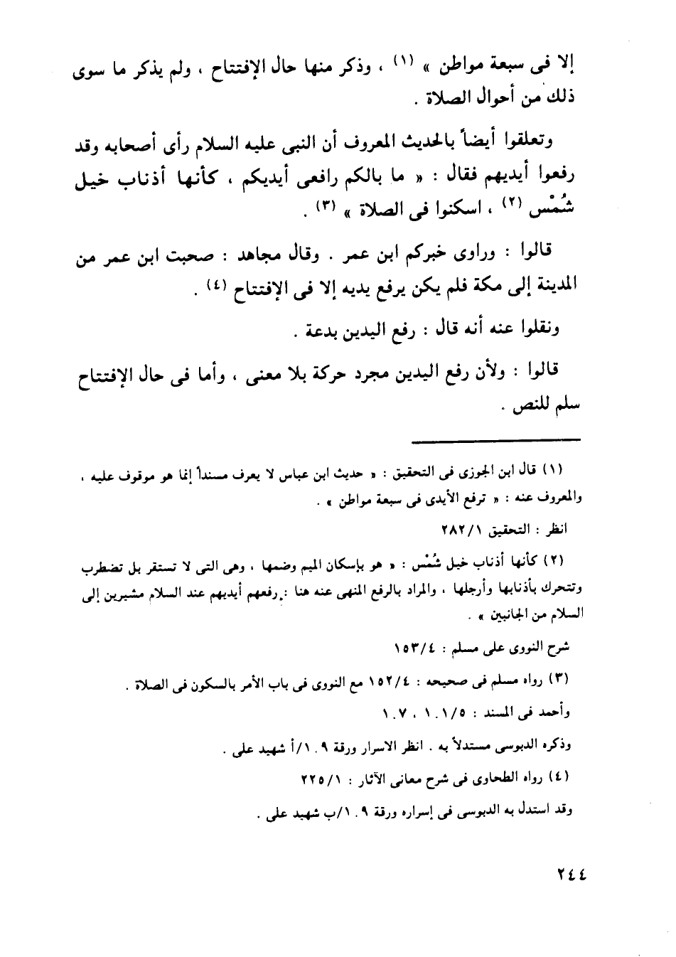 وتعلقوا أيضاً بالحديث المعروف أن النبي عليه السلام رأي أصحابه وقد رفعوا أيديهم فقال: ((ما بالكم رافعي أيديكم، كأنها أذناب خيل شمس، اسكنوا في الصلاة)).