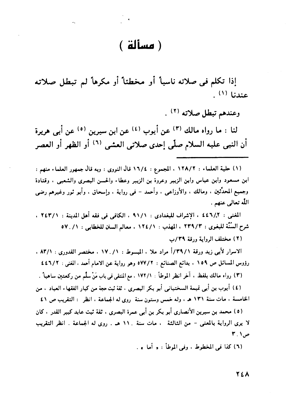 لنا: ما رواه مالك عن أيوب عن ابن سيرين عن أبي هريرة أن النبي عليه السلام صلى إحدى صلاتي العشى أو الظهر أو العصر