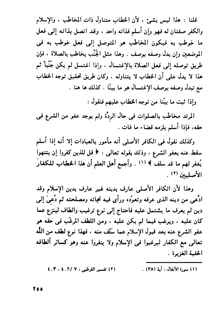 وكذلك نقول في الكافر الأصلي أنه مأمور بالعبادات إلا أنه إذا أسلم سقط عنه بعفو الشرع، وذلك بقوله تعالى: {قُلْ لِلَّذِينَ كَفَرُوا إِنْ يَنْتَهُوا يُغْفَرْ لَهُمْ مَا قَدْ سَلَفَ}. وأجمع أهل العلم أن هذا الخطاب للكفار الأصليين.
