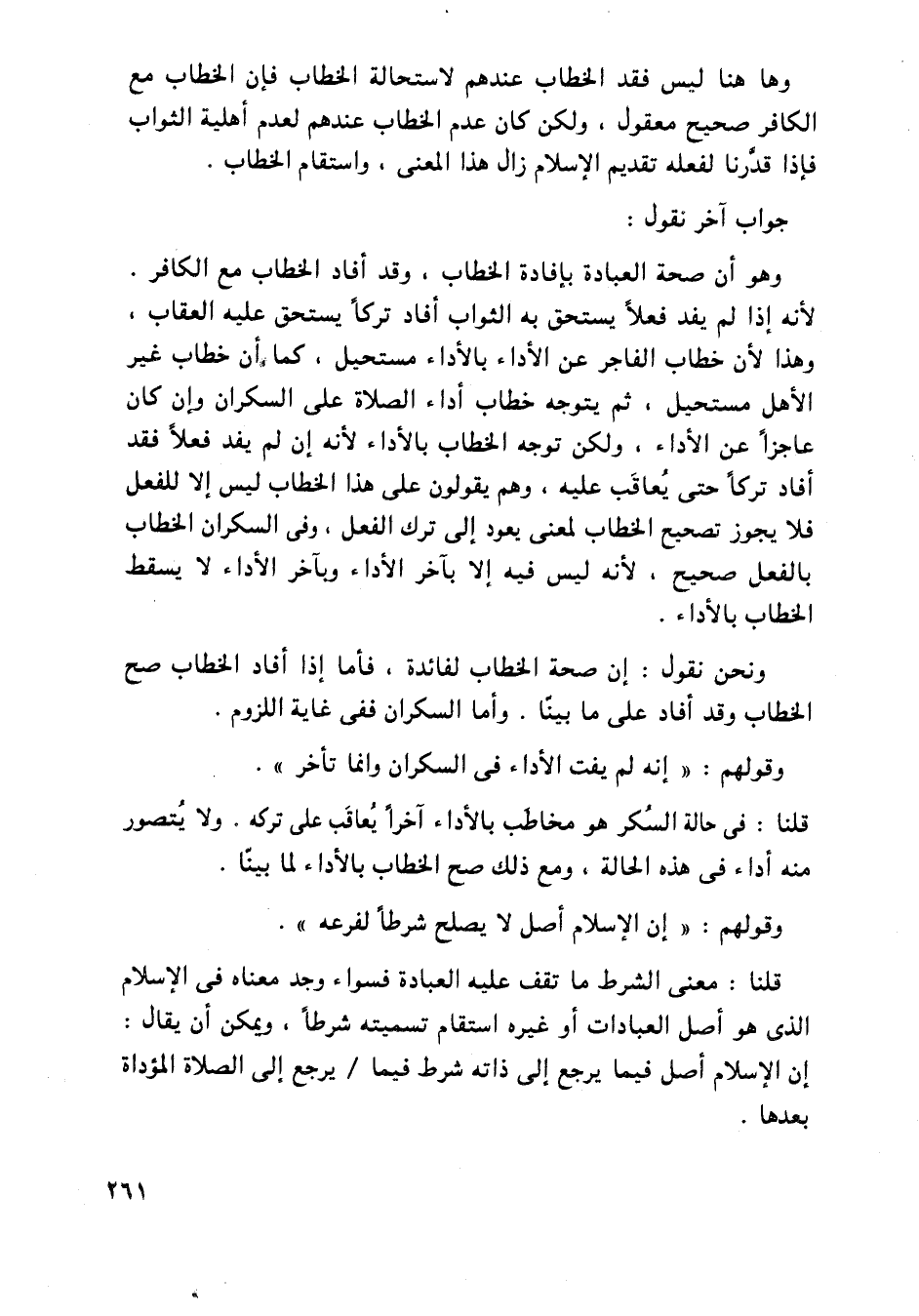 وهو أن صحة العبادة بإفادة الخطاب، وقد أفاد الخطاب مع الكافر. لأنه إذا لم يفد فعلاً يستحق به الثواب أفاد تركاً يستحق عليه العقاب، وهذا لأن خطاب الفاجر عن الأداء بالأداء مستحيل، كما أن خطاب غير الأهل مستحيل، ثم يتوجه خطاب أداء الصلاة على السكران وإن كان عاجزاً عن الأداء، ولكن توجه الخطاب بالأداء لأنه إن لم يفد فعلاً فقد أفاد تركاً حتى يعاقب عليه، وهم يقولون على هذا الخطاب ليس إلا للفعل فلا يجوز تصحيح الخطاب لمعنى يعود إلى ترك الفعل، وفي السكران الخطاب بالفعل صحيح، لأنه ليس فيه إلا بآخر الأداء وبآخر الأداء لا يسقط الخطاب بالأداء.