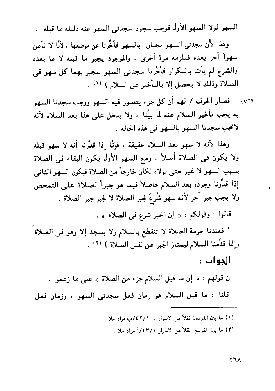فصار الحرف/ لهم أن كل جزء يتصور فيه السهو ووجب سجدتا السهو به يجب تأخير السلام عنه لما بينا، ولا يدخل على هذا بعد السلام لأنه لا تجب سجدتا السهو في هذه الحالة.